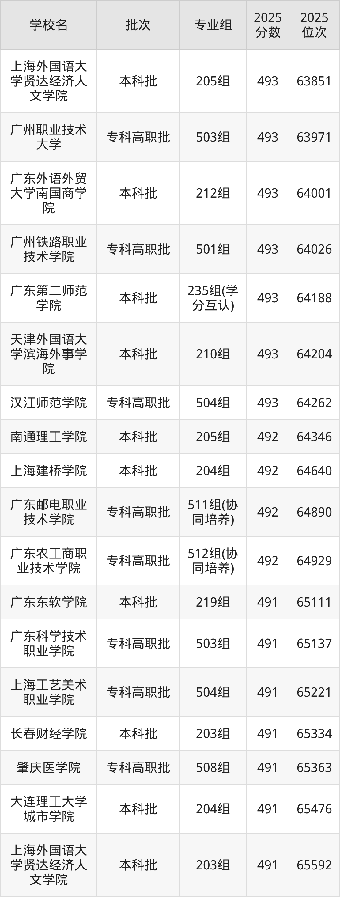 2025年广东高考历史类492分(64326名~65098名)能上的大学有南通理工学院205组、上海建桥学院204组、广东农工商职业技术学院512组(协同培养)、广东邮电职业技术学院511组(协同培养)。