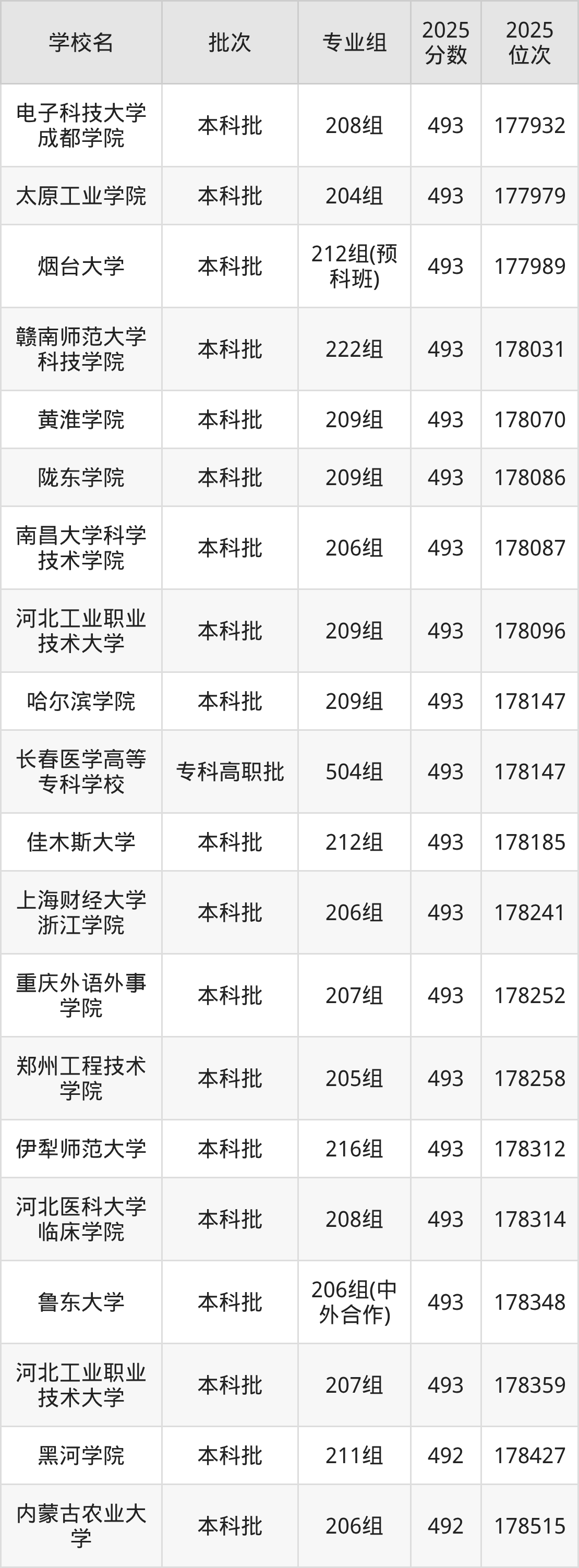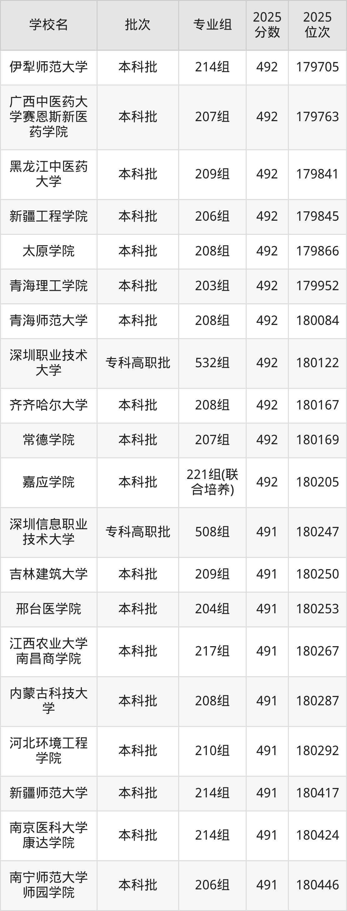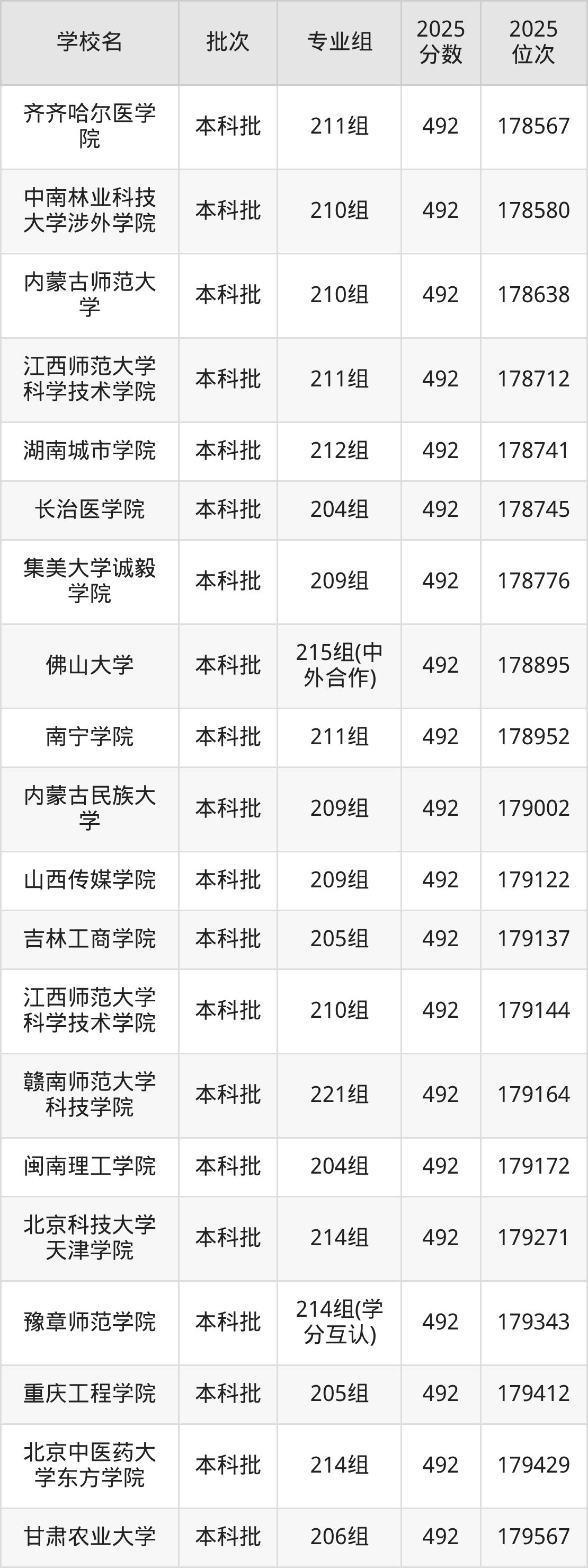 2025年广东高考物理类492分(178417名~180218名)能上的大学有长治医学院204组、内蒙古农业大学206组、内蒙古师范大学210组、内蒙古民族大学209组等。