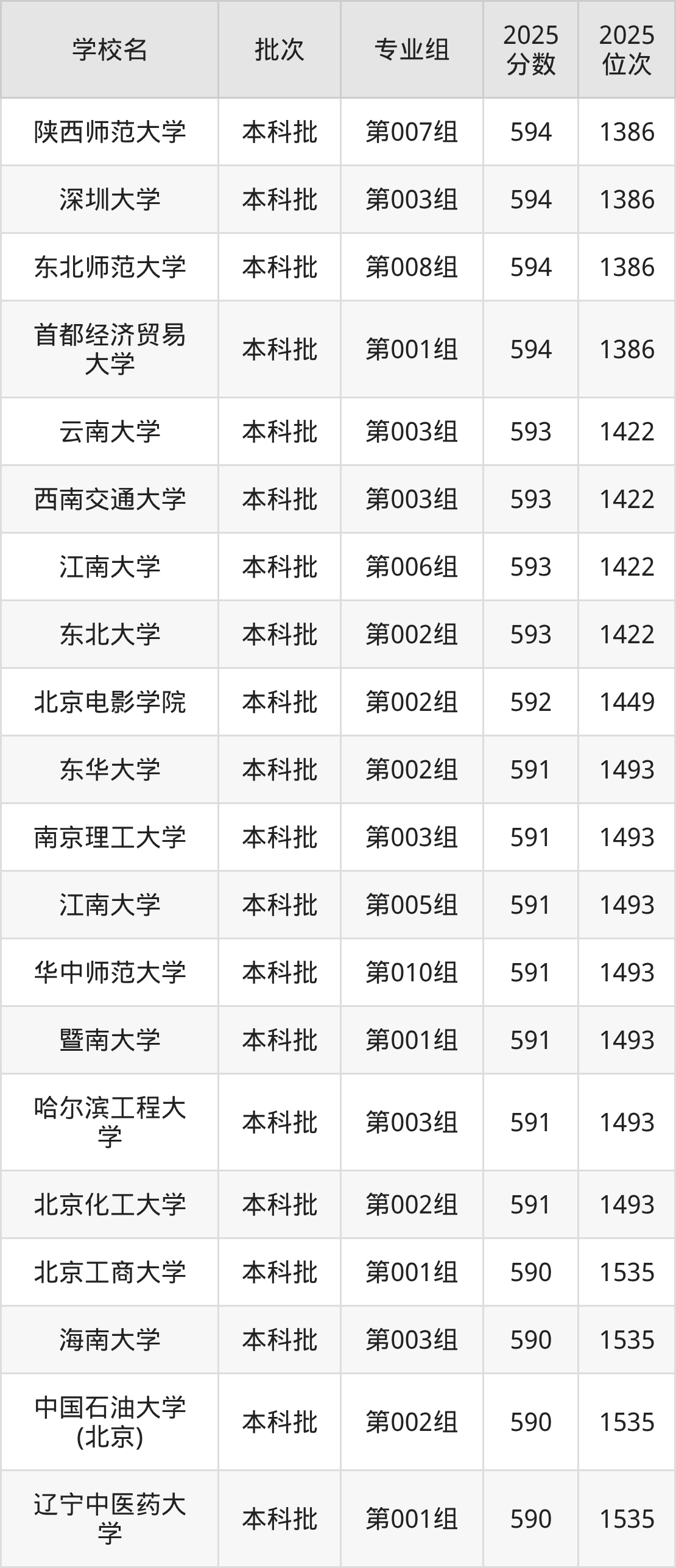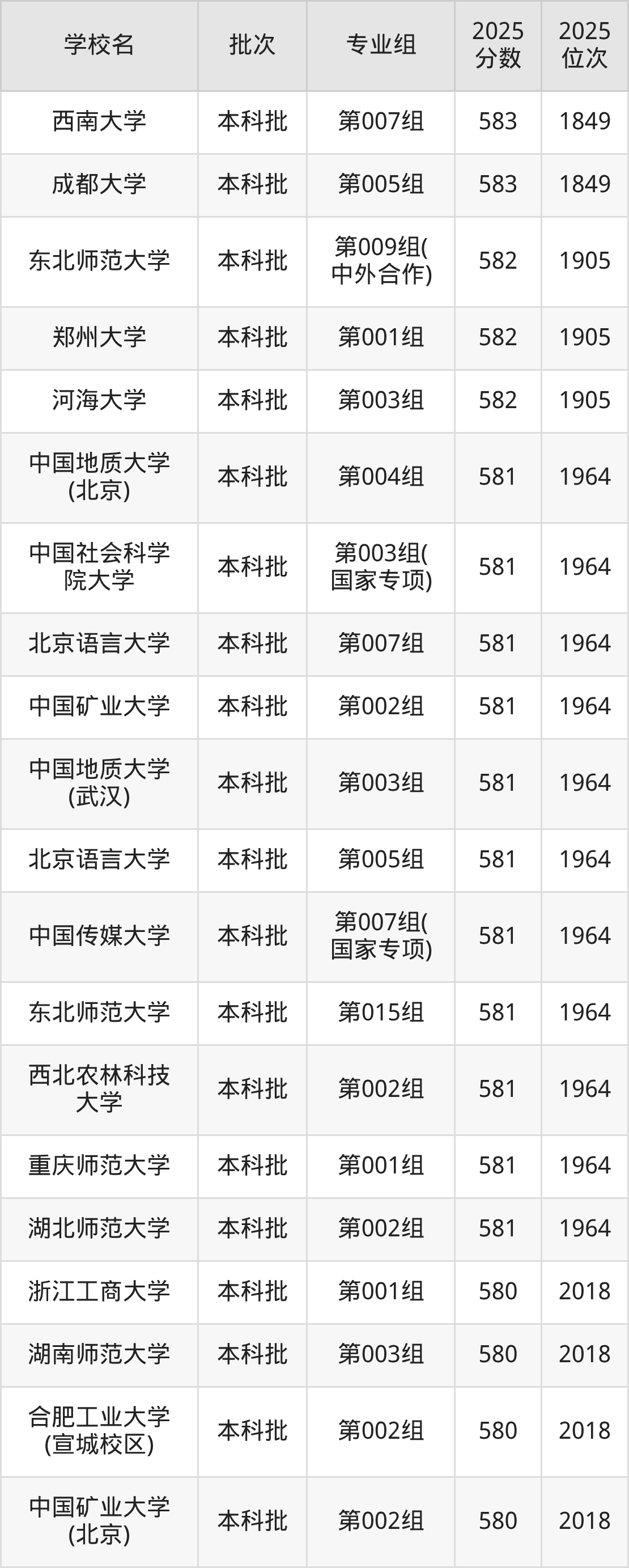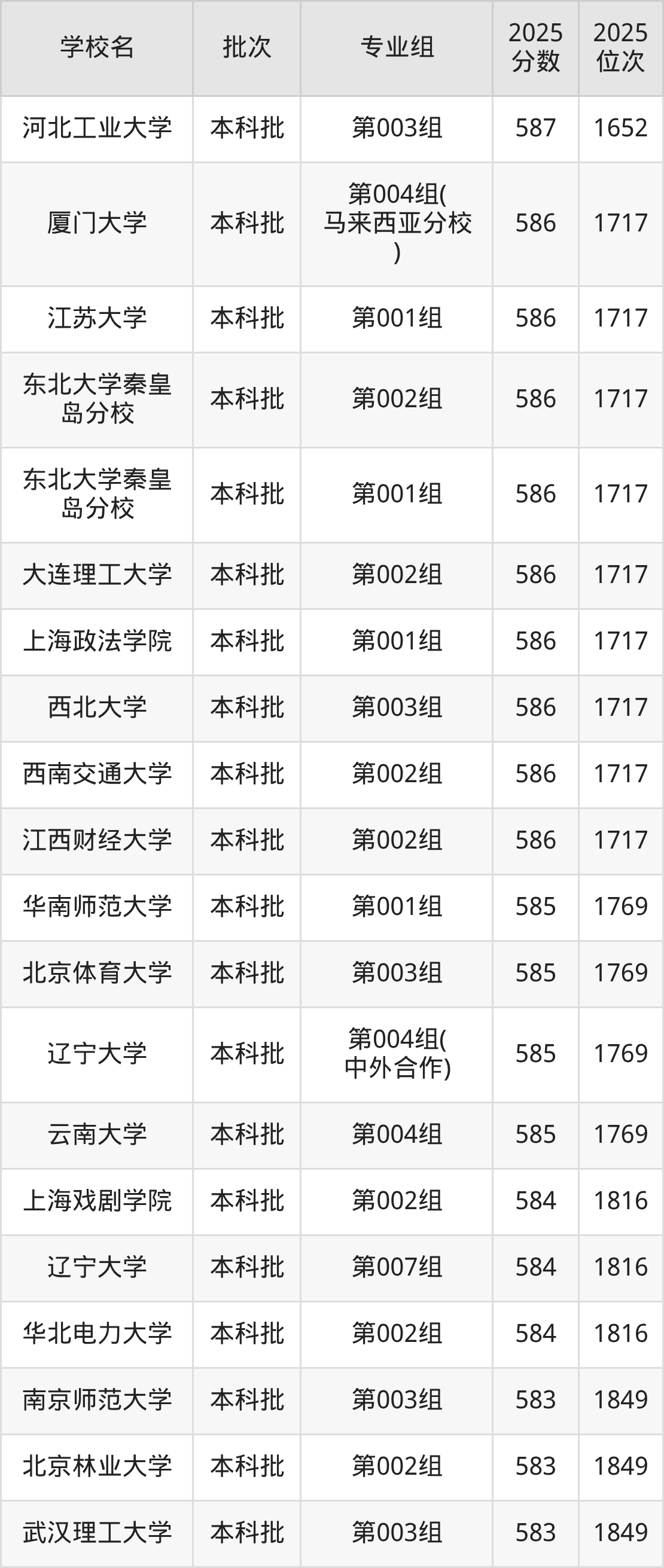 2025年吉林高考历史类582分(1850名~1905名)能上的大学有东北师范大学第009组(中外合作)、河海大学第003组、郑州大学第001组。