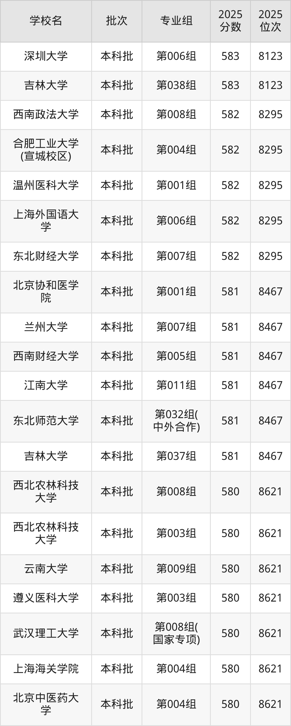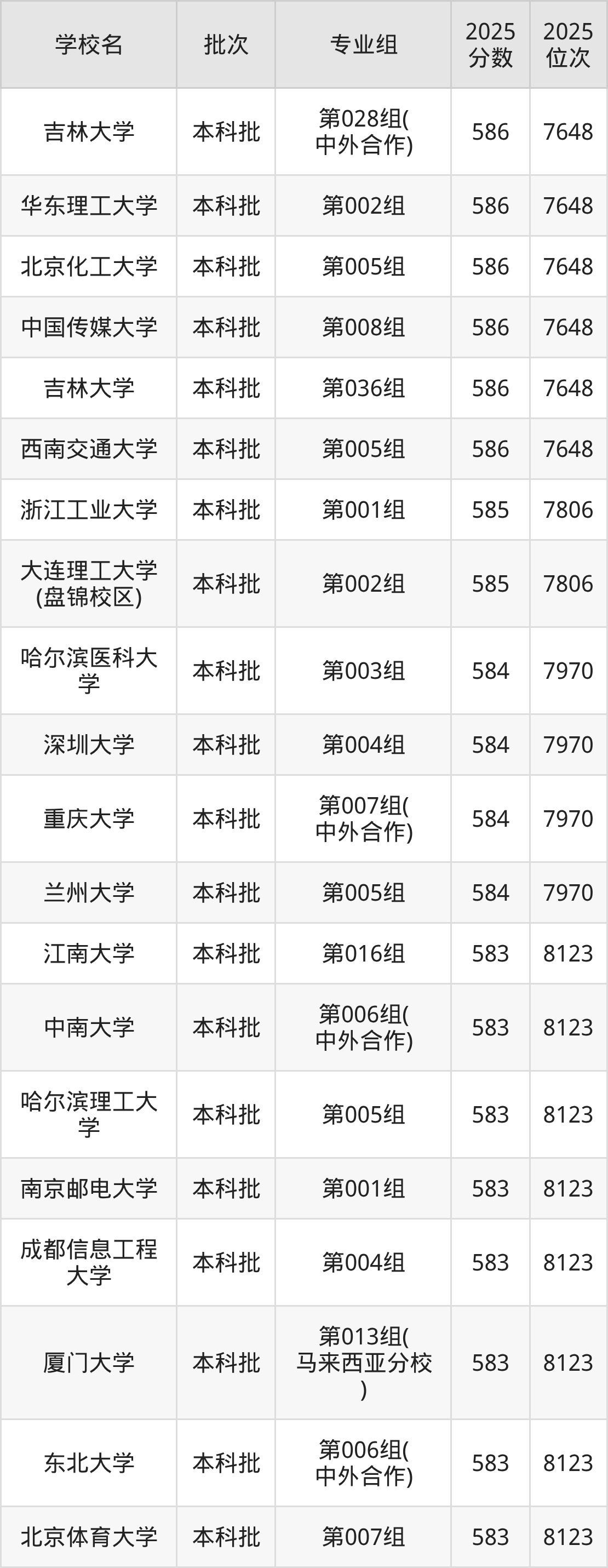 2025年吉林高考物理类582分(8124名~8295名)能上的大学有东北财经大学第007组、上海外国语大学第006组、温州医科大学第001组、合肥工业大学(宣城校区)第004组等。