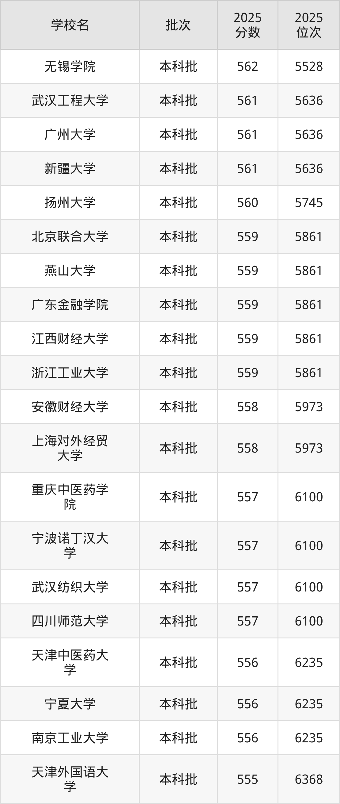 由于高考录取分数线历年波动较大,因此本文以该分数对应的位次排名为大家整理能上的大学名单。