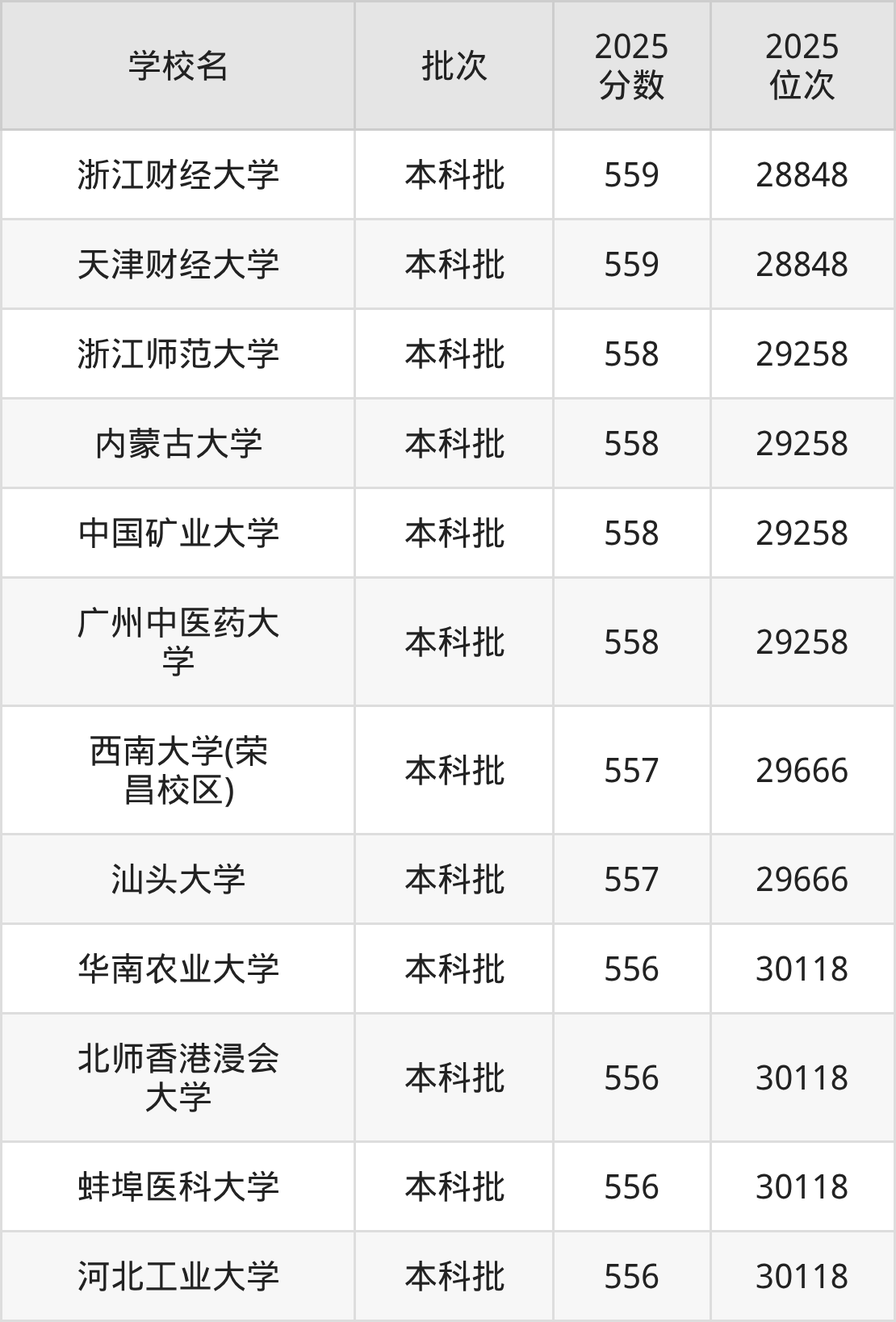 这些都是2026年高考物理类29259名~29666名考生可以报考的大学,更多学校名单如下表所示: