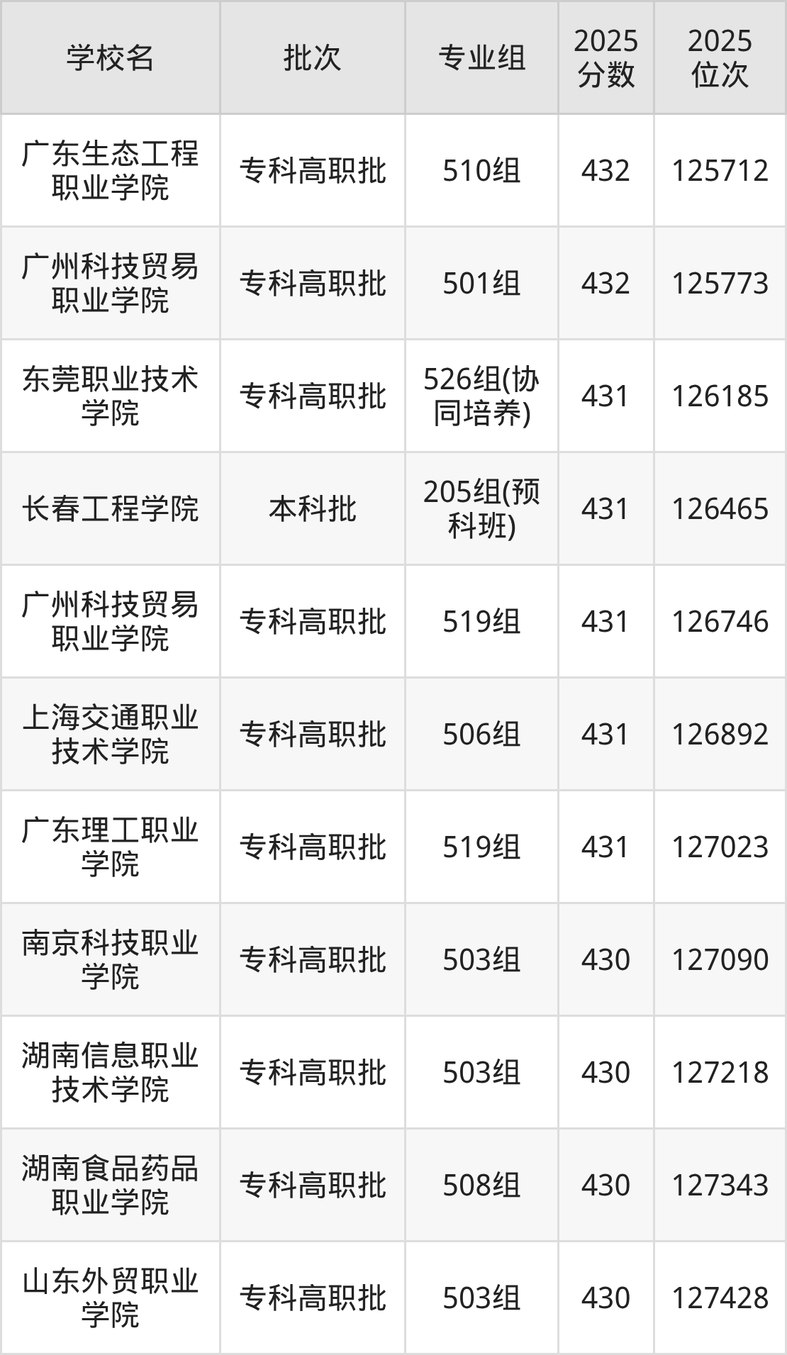 2025年广东高考历史类431分(125861名~127037名)能上的大学有长春工程学院205组(预科班)、上海交通职业技术学院506组、广东理工职业学院519组、广州科技贸易职业学院519组等。