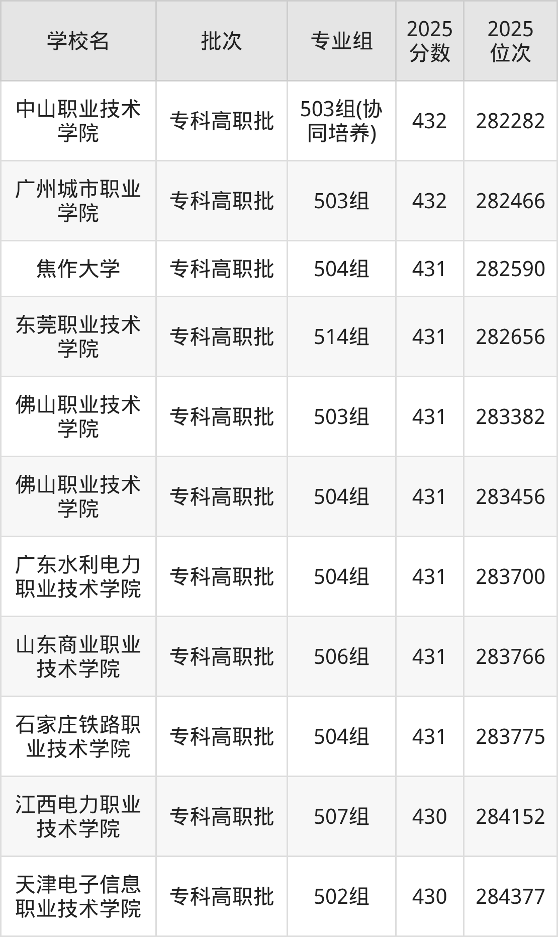 2025年广东高考物理类431分(282500名~283962名)能上的大学有山东商业职业技术学院506组、广东水利电力职业技术学院504组、焦作大学504组、佛山职业技术学院503组等。