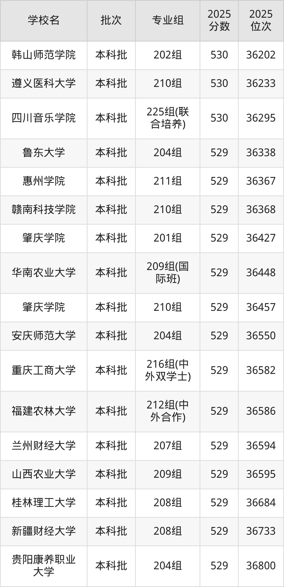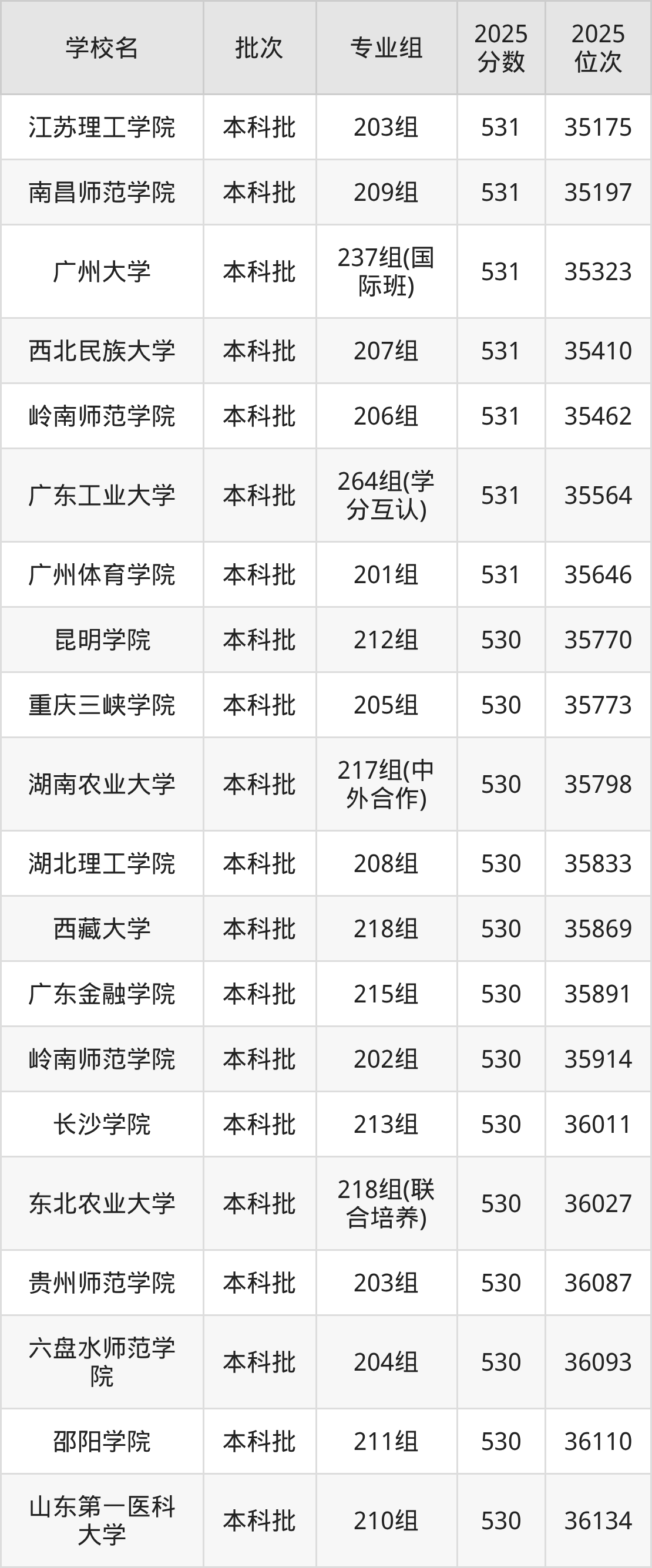 2025年广东高考历史类530分(35672名~36301名)能上的大学有东北农业大学218组(联合培养)、山东第一医科大学210组、湖南农业大学217组(中外合作)、邵阳学院211组等。