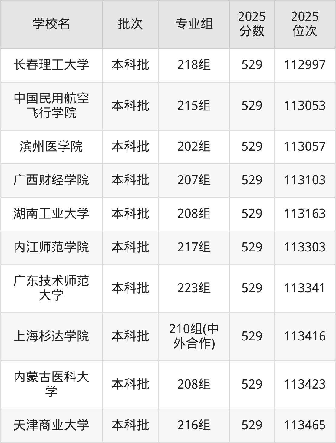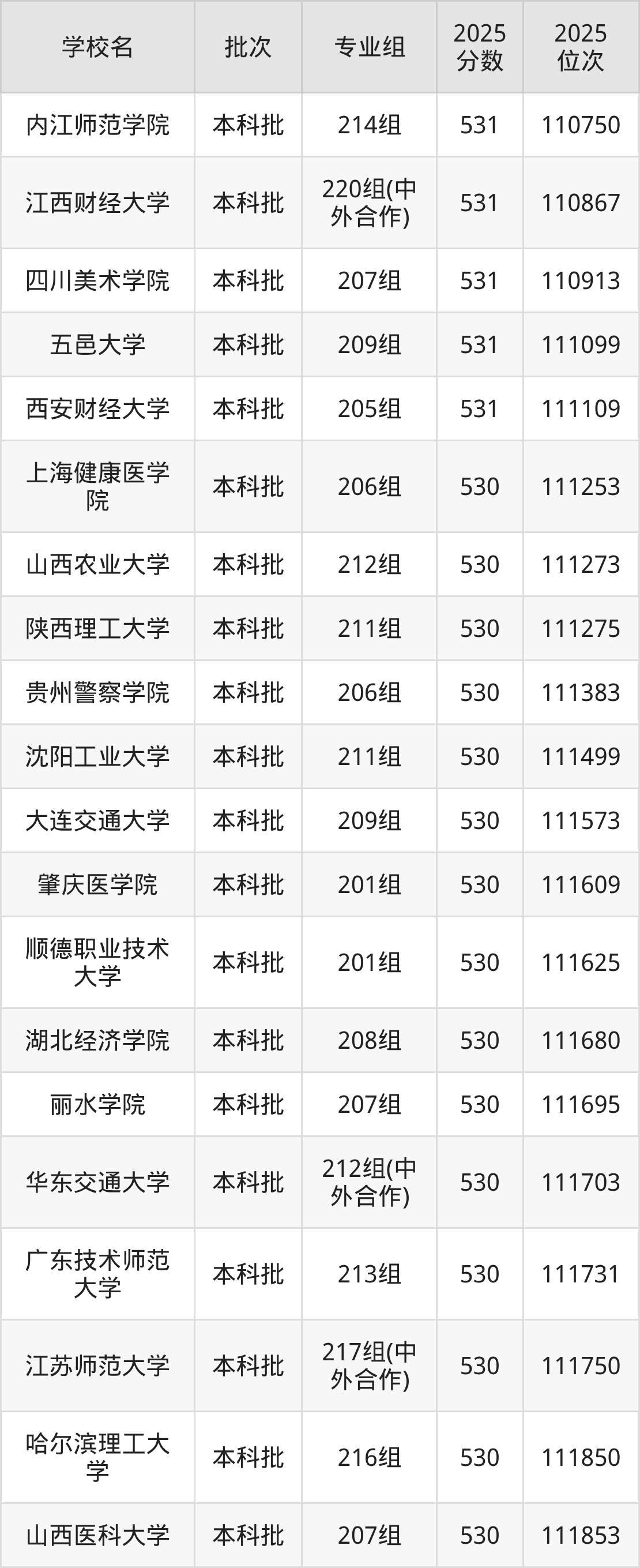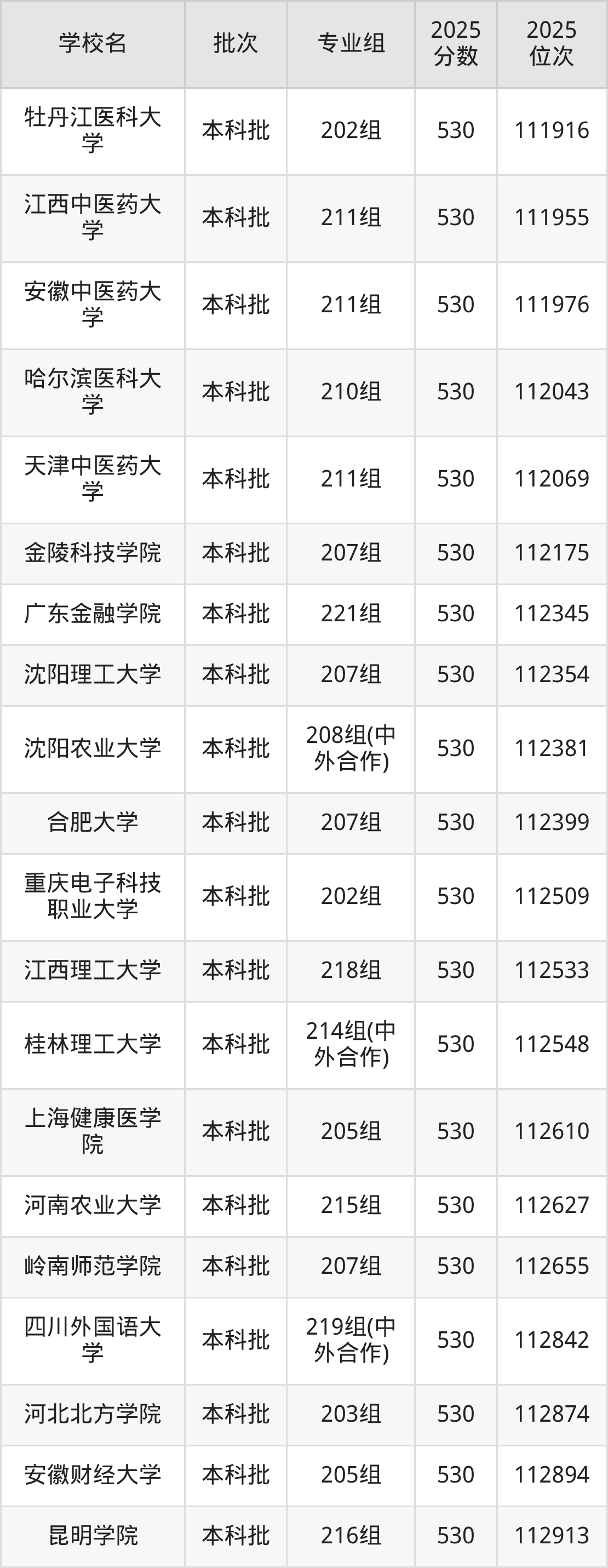 2025年广东高考物理类530分(111215名~112996名)能上的大学有天津中医药大学211组、河北北方学院203组、山西农业大学212组、山西医科大学207组等。