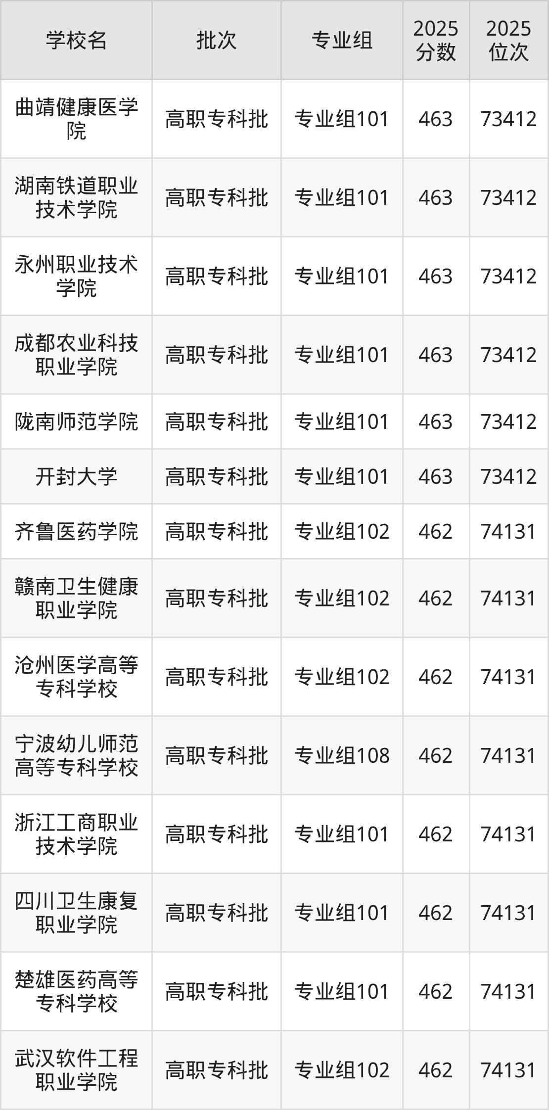 2025年四川高考历史类462分(73413名~74131名)能上的大学有楚雄医药高等专科学校专业组101、四川卫生康复职业学院专业组101、沧州医学高等专科学校专业组102、齐鲁医药学院专业组102等。