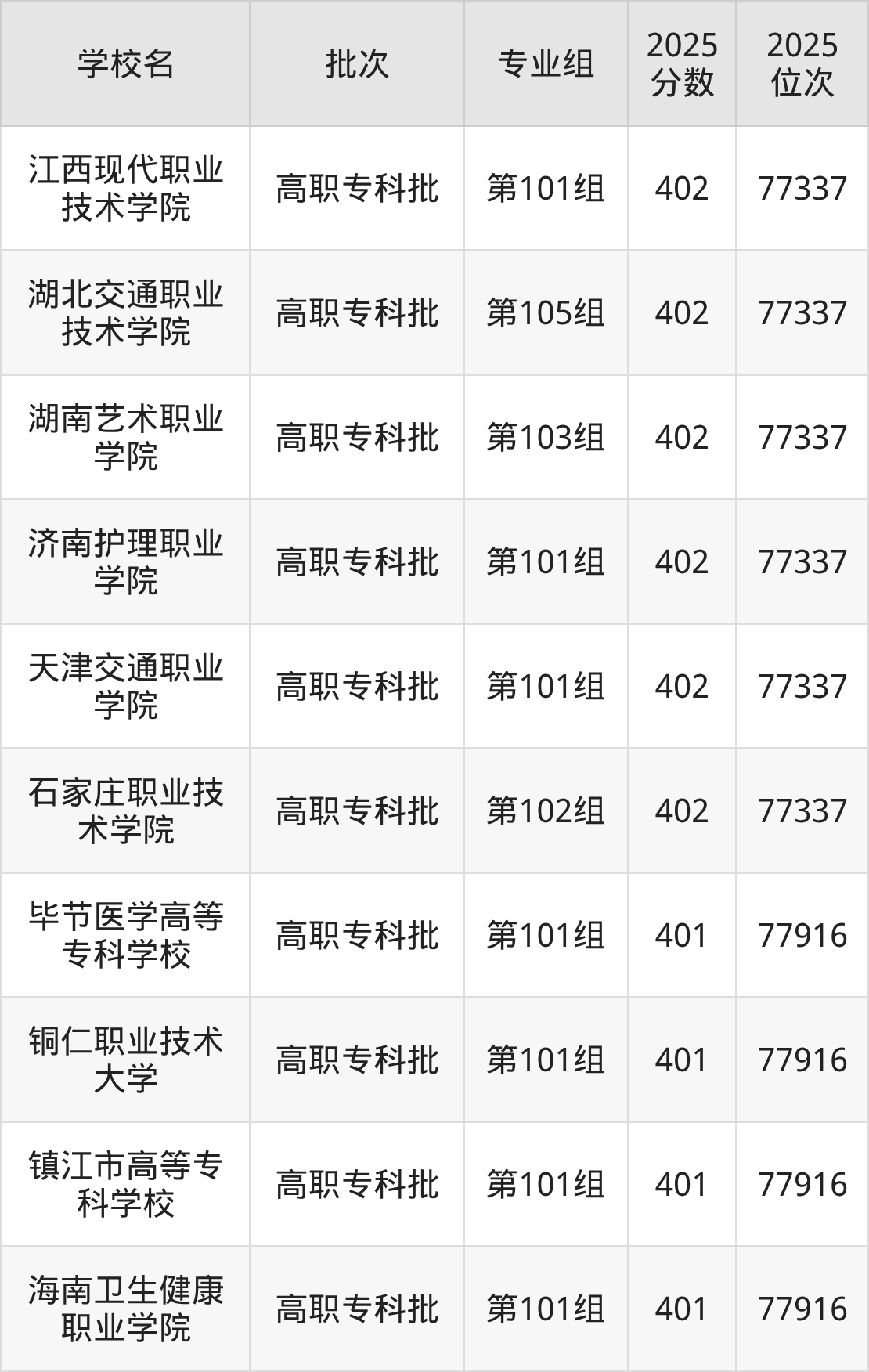2025年湖南高考历史类401分(77338名~77916名)能上的大学有镇江市高等专科学校第101组、海南卫生健康职业学院第101组、毕节医学高等专科学校第101组、铜仁职业技术大学第101组。