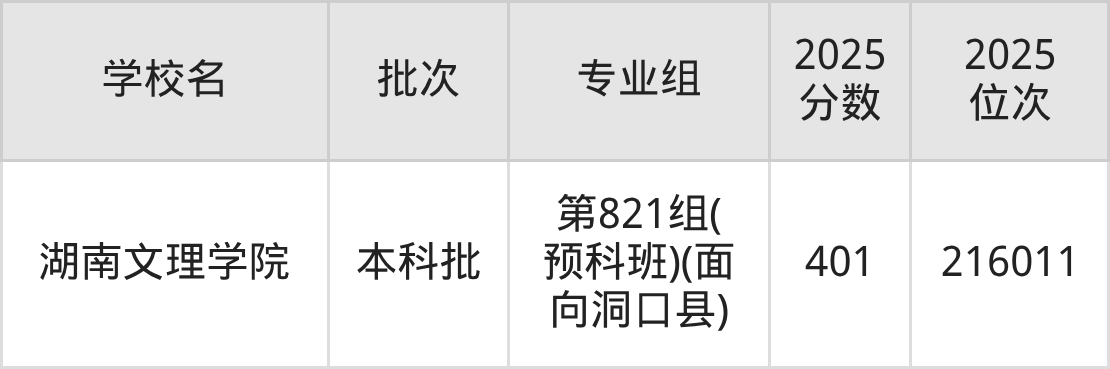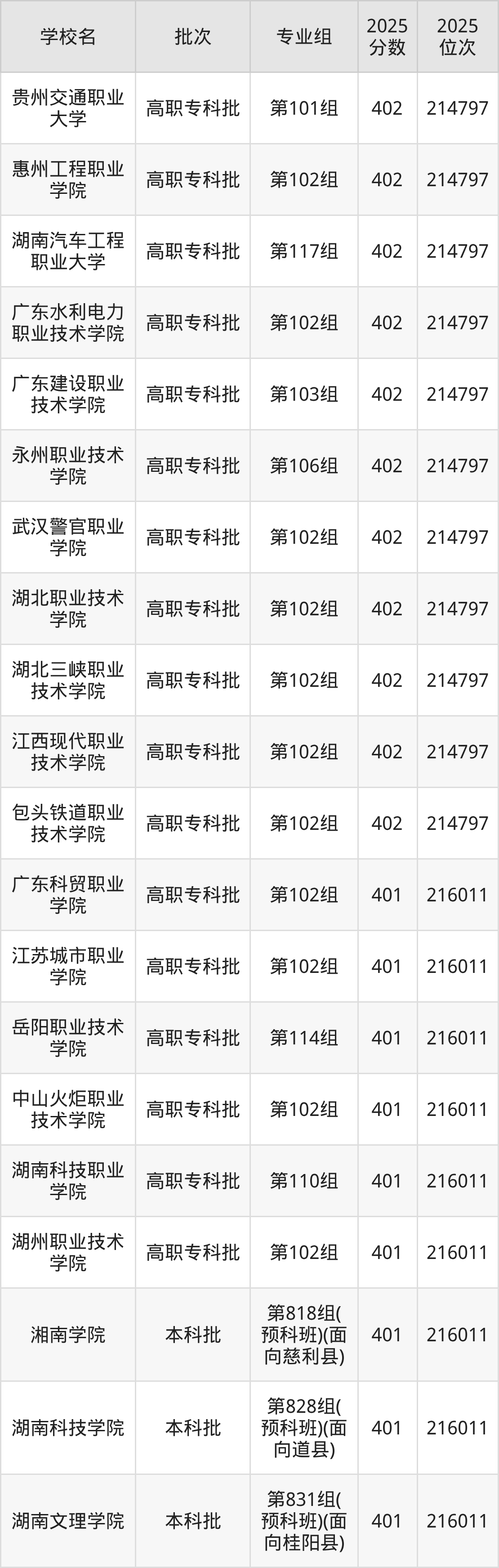 2025年湖南高考物理类401分(214798名~216011名)能上的大学有湖南文理学院第821组(预科班)(面向洞口县)、湖南文理学院第831组(预科班)(面向桂阳县)、湖南科技学院第828组(预科班)(面向道县)、湘南学院第818组(预科班)(面向慈利县)等。