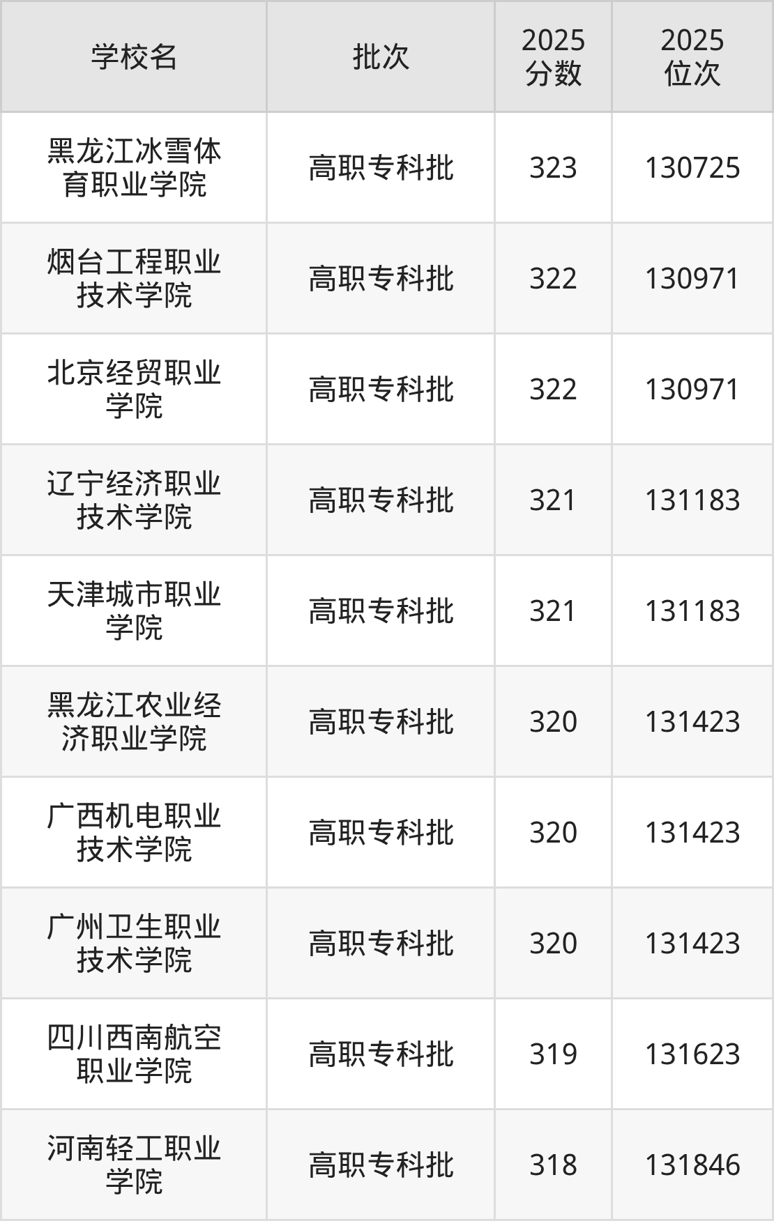 2025年辽宁高考物理类320分(131184名~131423名)能上的大学有广西机电职业技术学院、黑龙江农业经济职业学院、广州卫生职业技术学院。