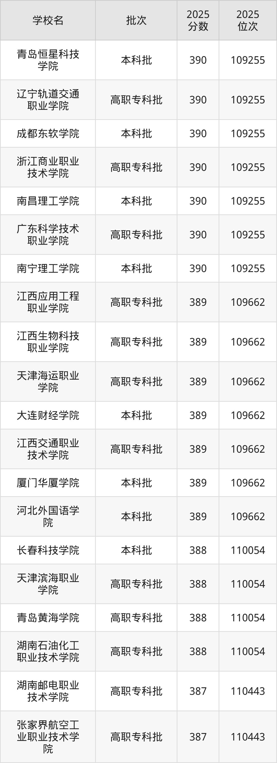 2025年辽宁高考物理类388分(109663名~110054名)能上的大学有天津滨海职业学院、青岛黄海学院、长春科技学院、湖南石油化工职业技术学院。