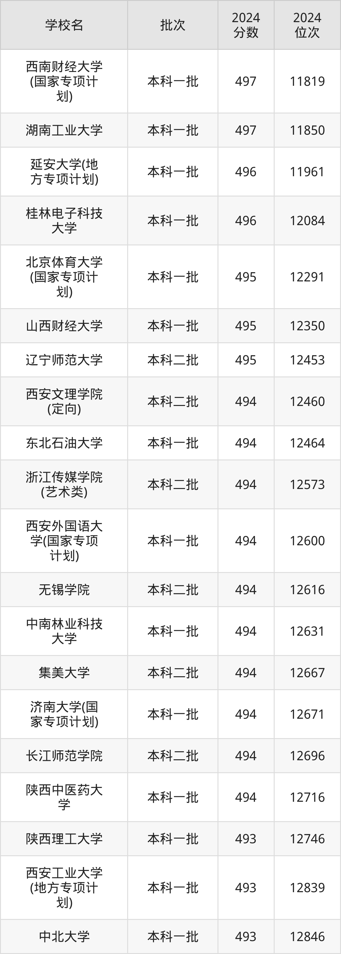 2024年陕西高考文科495分(12199名~12455名)能上的大学有山西财经大学、辽宁师范大学、北京体育大学(国家专项计划)。