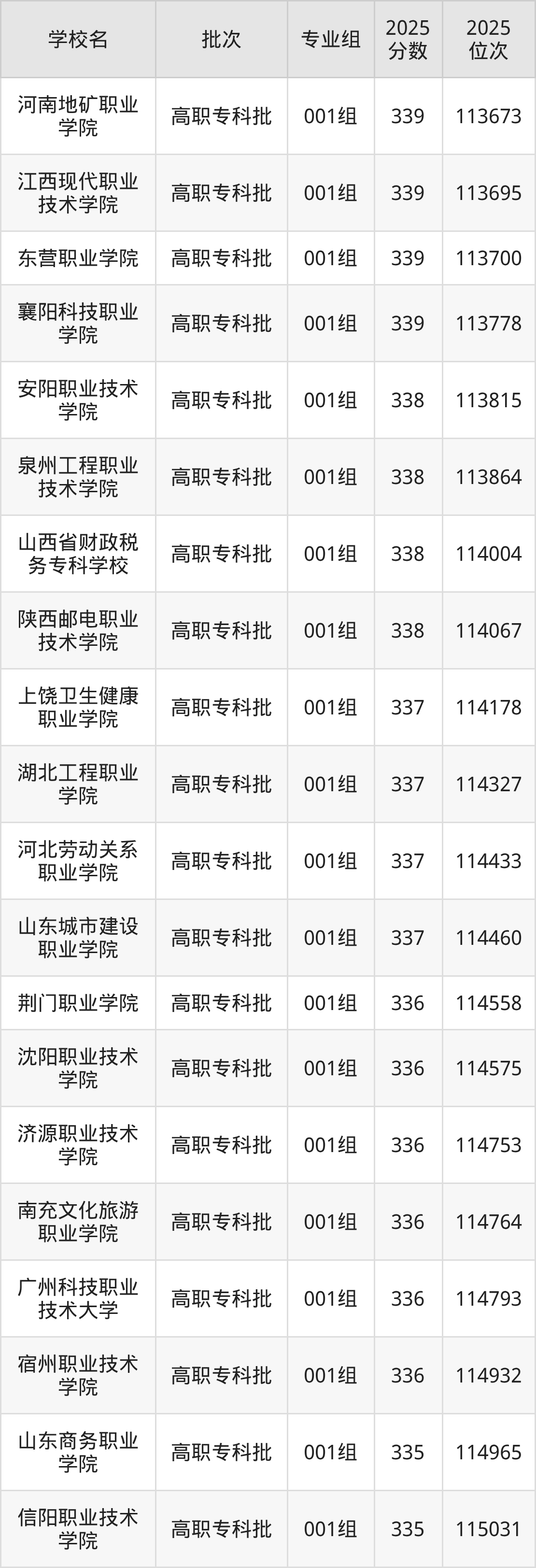 2025年安徽高考历史类337分(114171名~114554名)能上的大学有河北劳动关系职业学院001组、湖北工程职业学院001组、山东城市建设职业学院001组、上饶卫生健康职业学院001组。