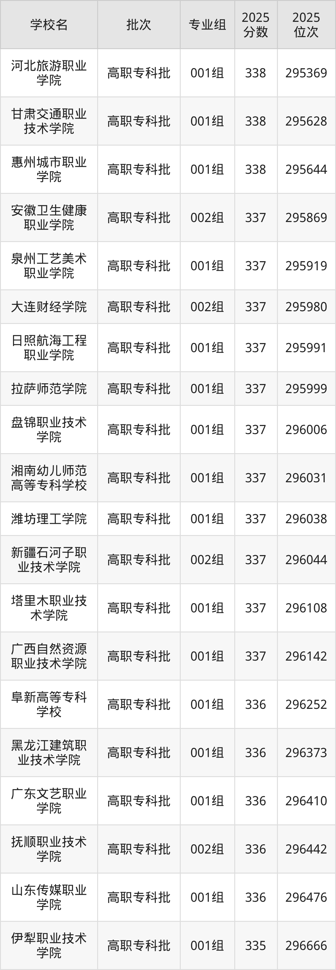 另外录取位次低于该区间(较稳妥)的有阜新高等专科学校001组(296252名)、黑龙江建筑职业技术学院001组(296373名)等;录取位次高于该区间(可冲)的有惠州城市职业学院001组(295644名)、甘肃交通职业技术学院001组(295628名)等。