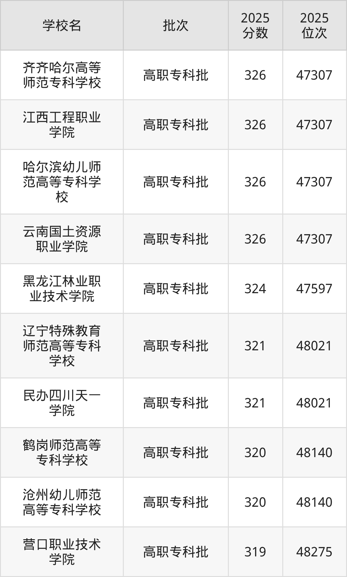 2025年辽宁高考历史类322分(47737名~47872名)录取位次低于该区间(较稳妥)的有民办四川天一学院(48021名)、辽宁特殊教育师范高等专科学校(48021名)等;录取位次高于该区间(可冲)的有黑龙江林业职业技术学院(47597名)、齐齐哈尔高等师范专科学校(47307名)等。