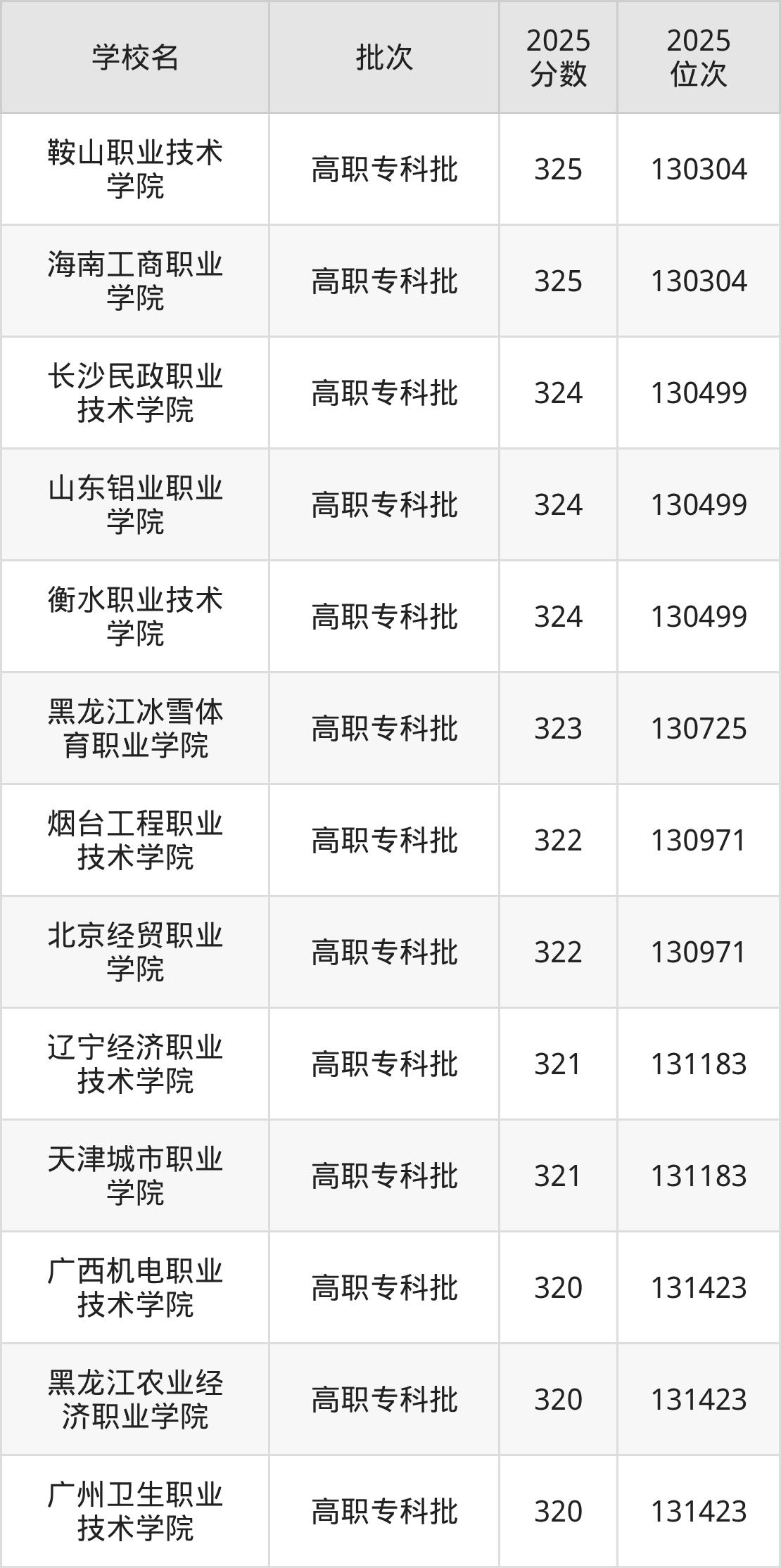 2025年辽宁高考物理类322分(130726名~130971名)能上的大学有烟台工程职业技术学院、北京经贸职业学院。
