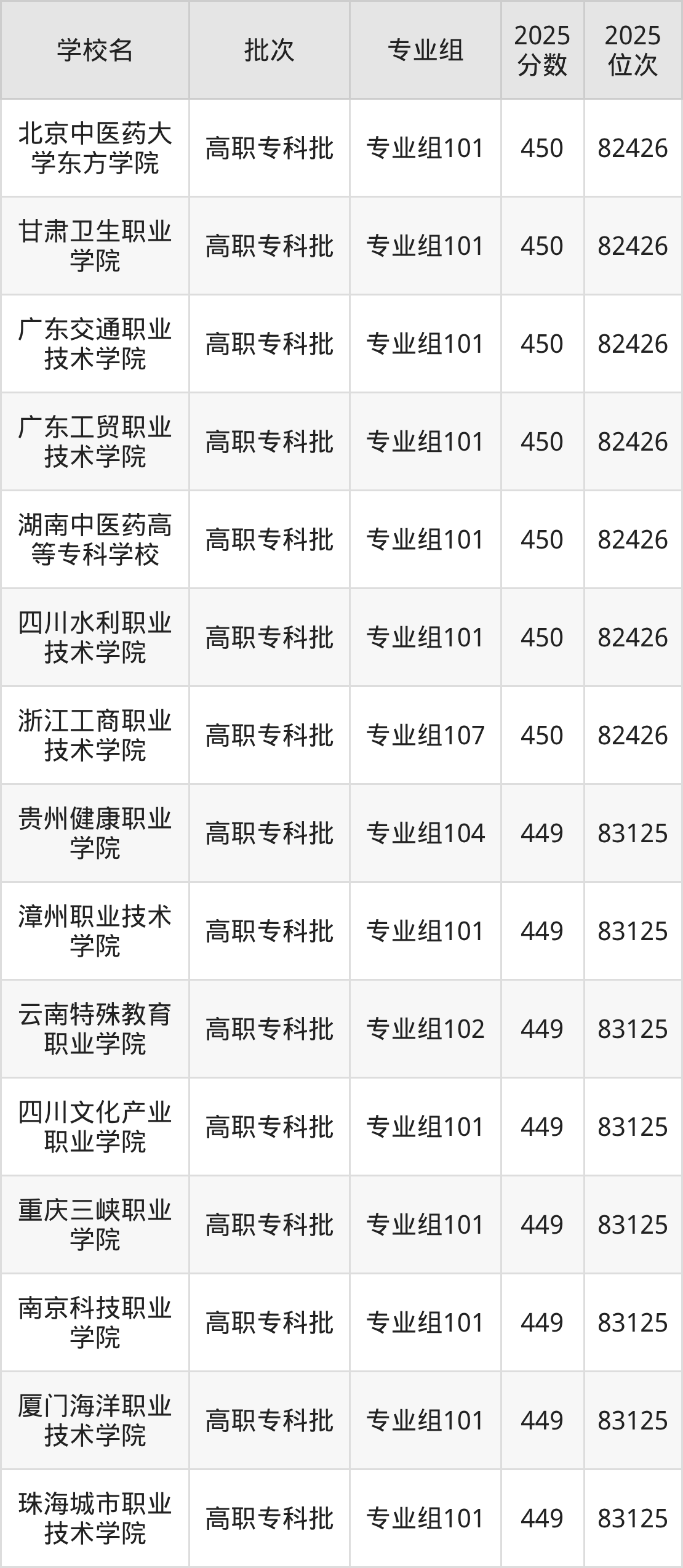2025年四川高考历史类449分(82427名~83125名)能上的大学有南京科技职业学院专业组101、珠海城市职业技术学院专业组101、厦门海洋职业技术学院专业组101、贵州健康职业学院专业组104等。