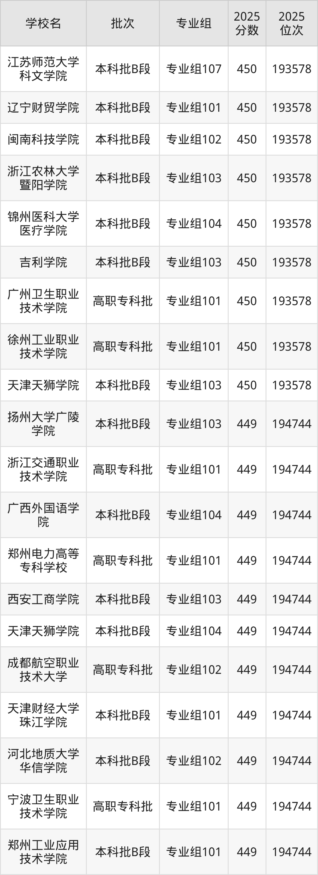 2025年四川高考物理类449分(193579名~194744名)能上的大学有武汉职业技术大学专业组101、扬州大学广陵学院专业组103、郑州工业应用技术学院专业组101、宁波卫生职业技术学院专业组101等。