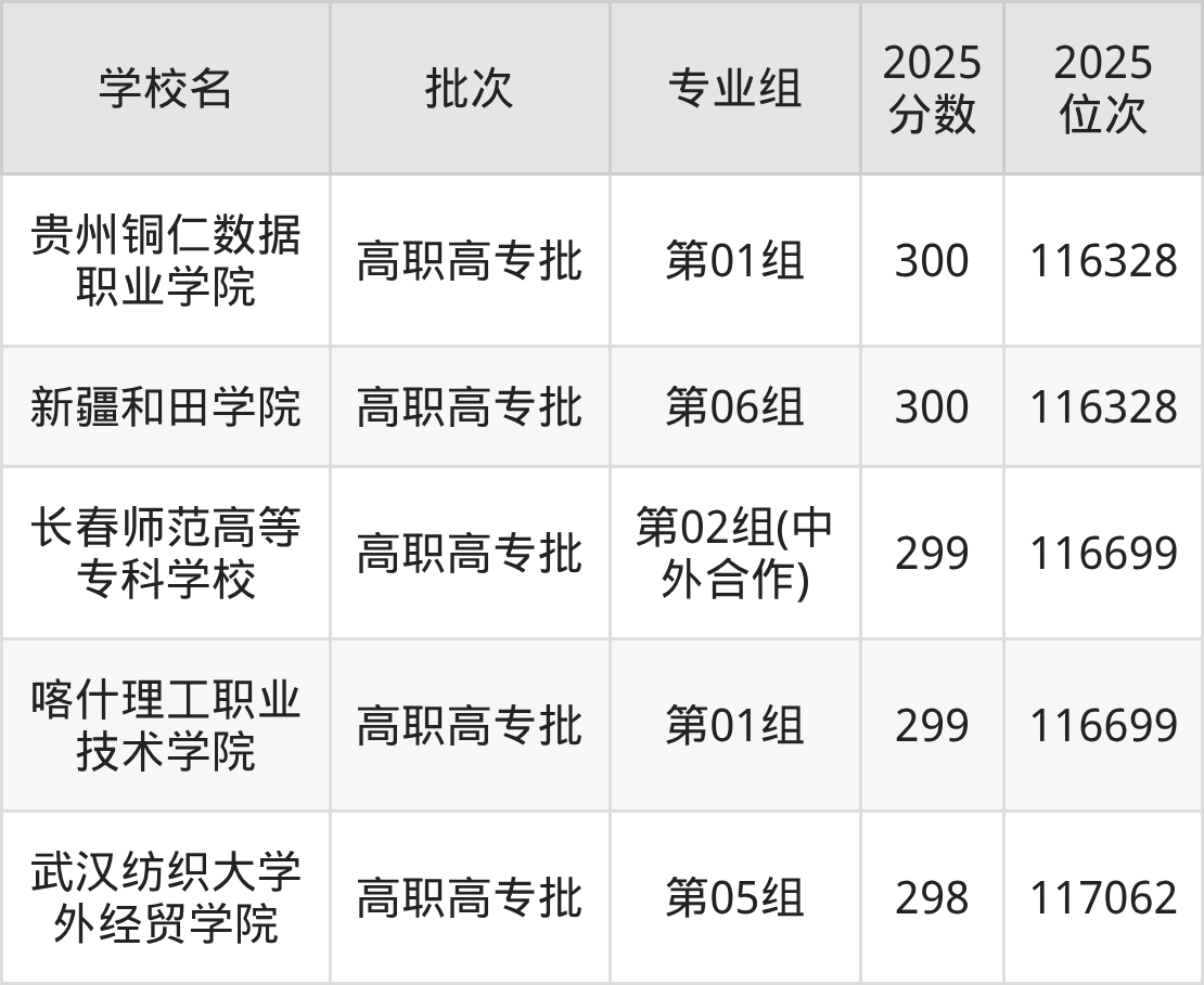 另外录取位次低于该区间(较稳妥)的有文华学院第08组(117786名)、贵州应用技术职业学院第01组(117786名)等;录取位次高于该区间(可冲)的有喀什理工职业技术学院第01组(116699名)、长春师范高等专科学校第02组(中外合作)(116699名)等。