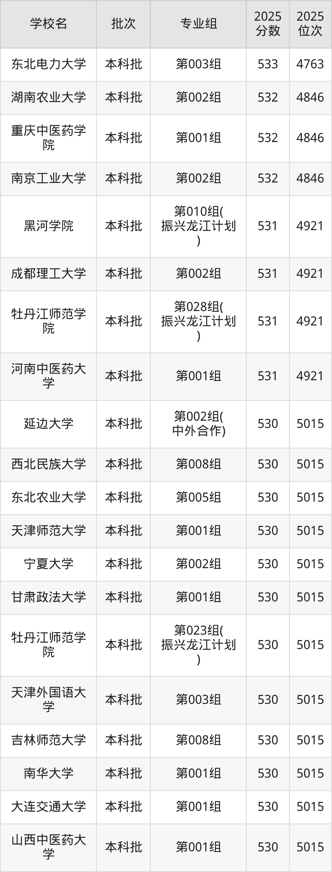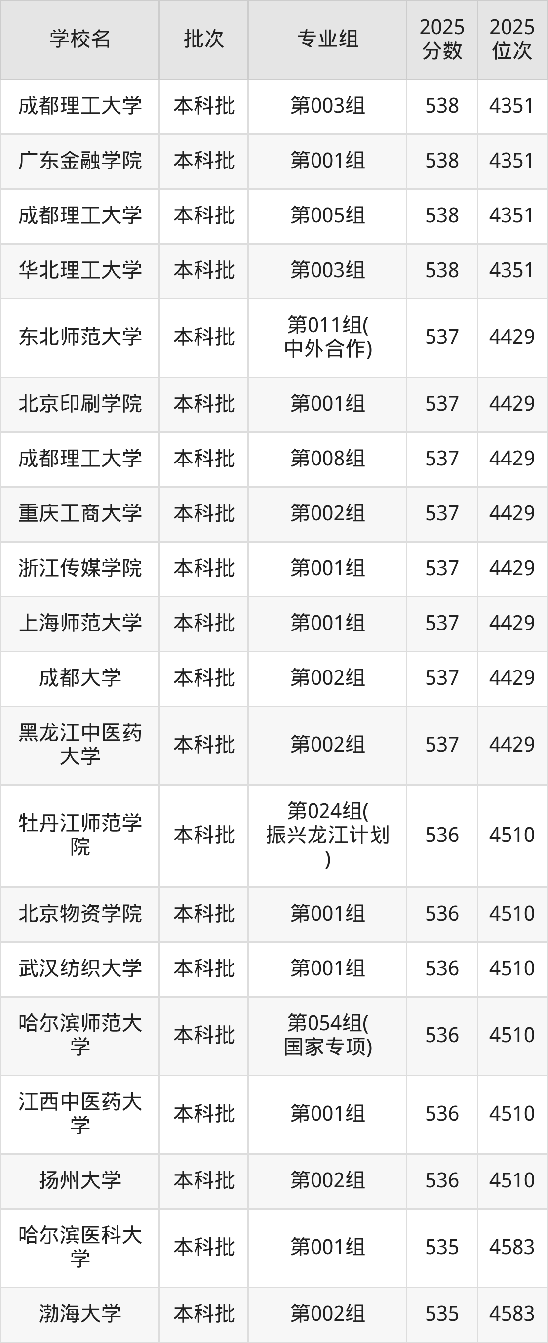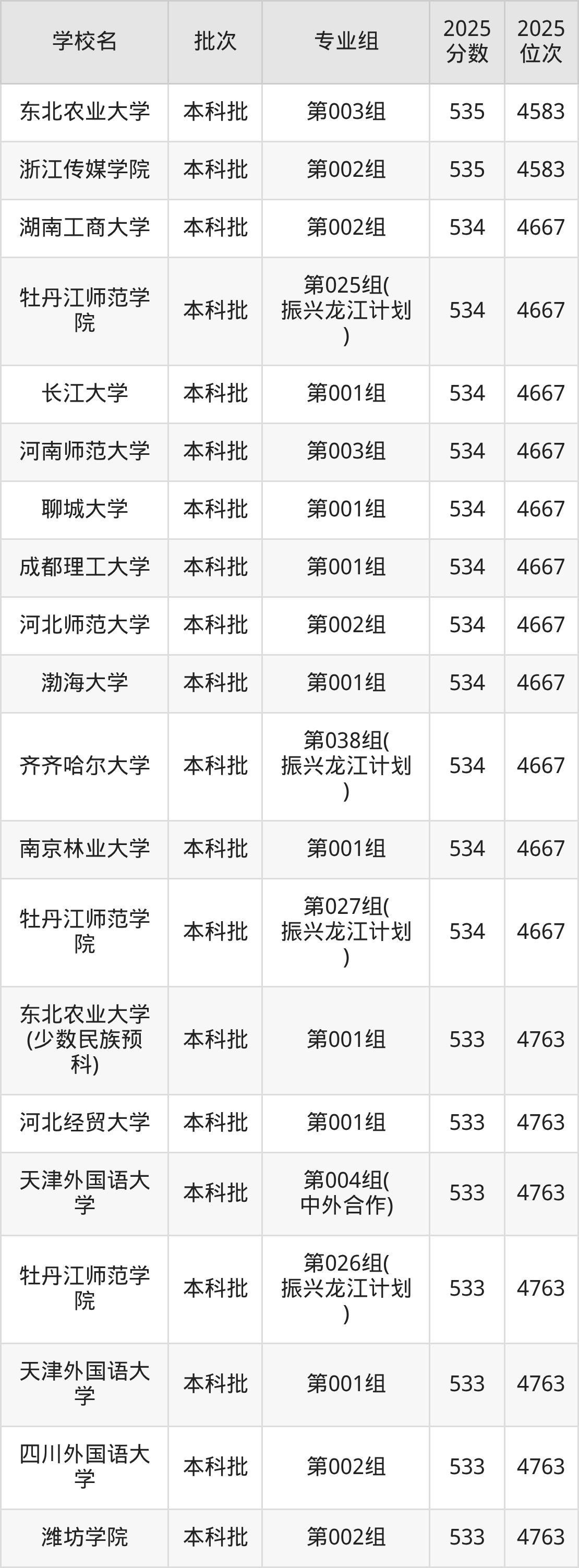 2025年黑龙江高考历史类535分(4511名~4583名)能上的大学有渤海大学第002组、东北农业大学第003组、哈尔滨医科大学第001组、浙江传媒学院第002组。
