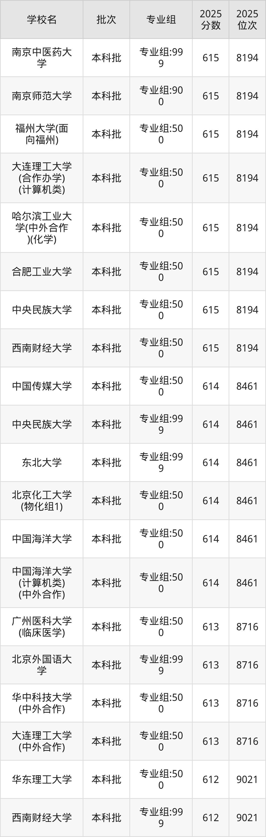 2025年福建高考物理类613分(8462名~8716名)能上的大学有北京外国语大学专业组:999、大连理工大学(中外合作)专业组:500、广州医科大学(临床医学)专业组:500、华中科技大学(中外合作)专业组:500。