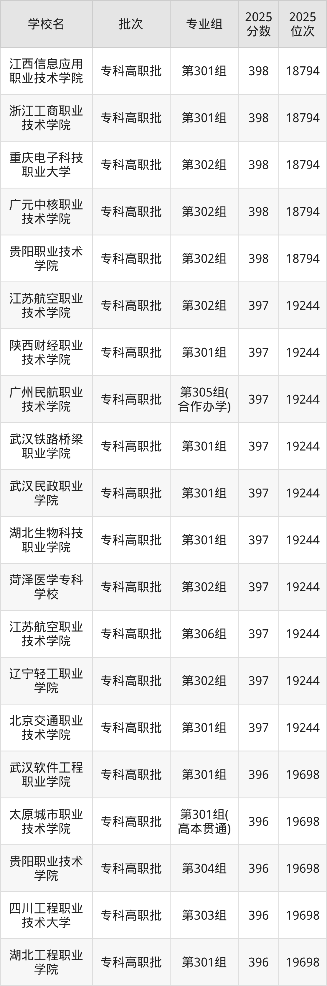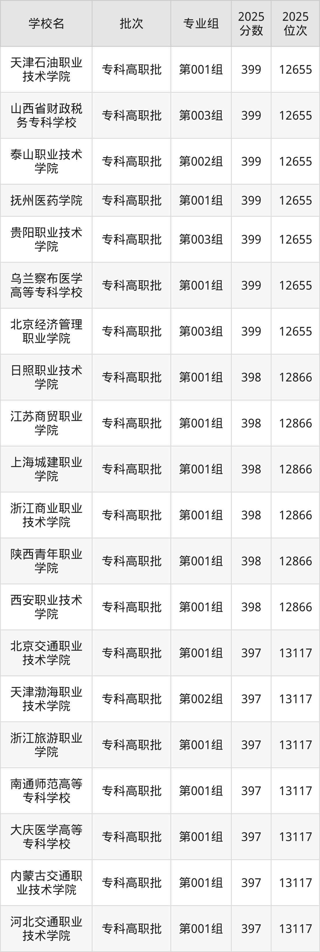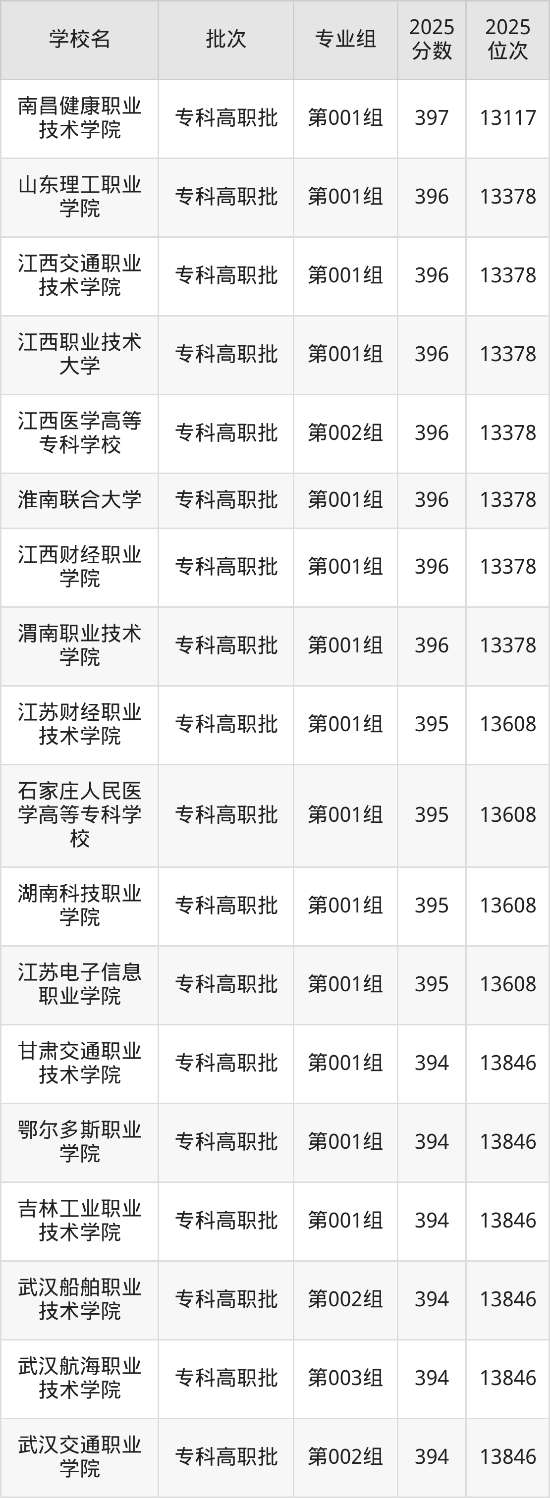 2025年山西高考历史类396分(13118名~13378名)能上的大学有淮南联合大学第001组、江西医学高等专科学校第002组、江西职业技术大学第001组、江西交通职业技术学院第001组等。