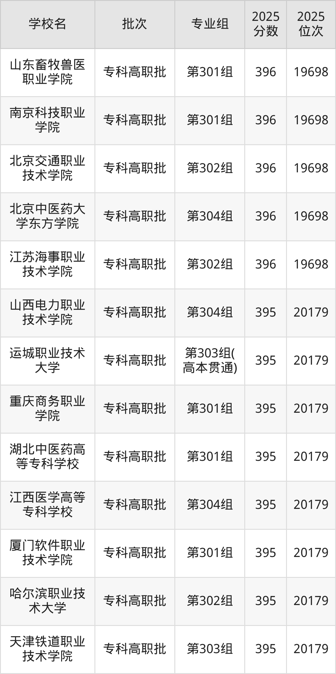 2025年山西高考物理类396分(19245名~19698名)能上的大学有北京交通职业技术学院第302组、北京中医药大学东方学院第304组、江苏海事职业技术学院第302组、南京科技职业学院第301组等。
