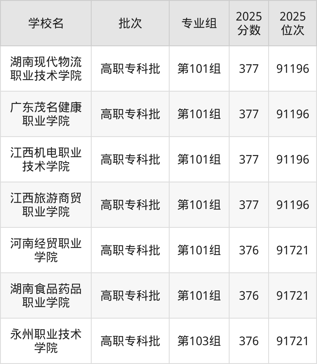 2025年湖南高考历史类376分(91197名~91721名)能上的大学有河南经贸职业学院第101组、永州职业技术学院第103组、湖南食品药品职业学院第101组。