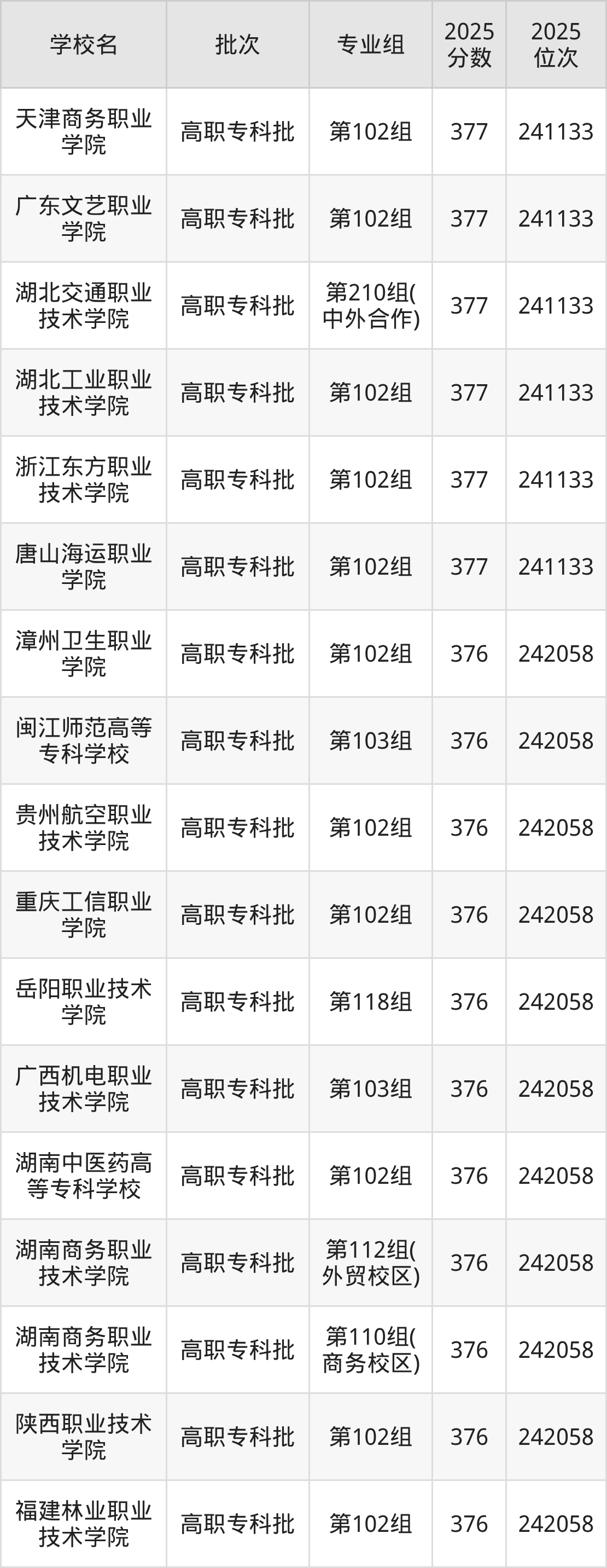 2025年湖南高考物理类376分(241134名~242058名)能上的大学有闽江师范高等专科学校第103组、福建林业职业技术学院第102组、漳州卫生职业学院第102组、湖南商务职业技术学院第110组(商务校区)等。