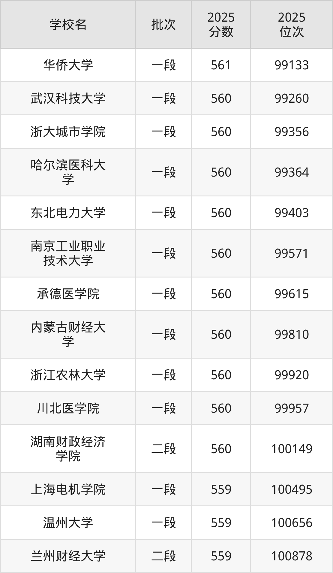 2025年浙江高考560分(99219名~100479名)能上的大学有湖南财政经济学院、川北医学院、承德医学院、内蒙古财经大学等。