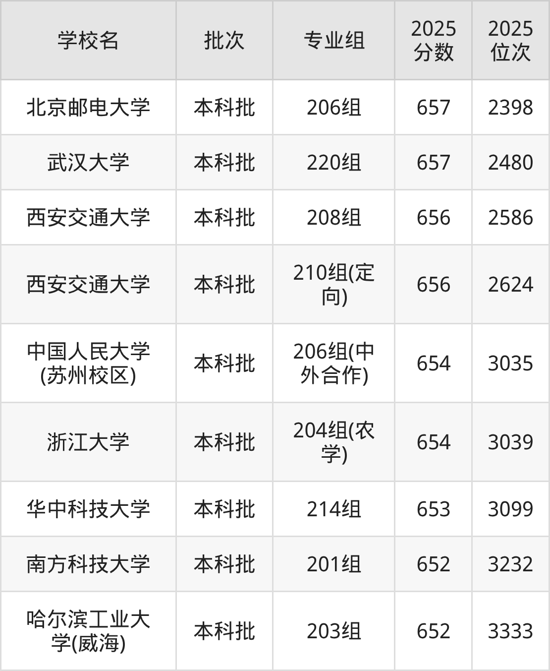 2025年广东高考物理类654分(2846名~3043名)能上的大学有浙江大学204组(农学)、中国人民大学(苏州校区)206组(中外合作)。