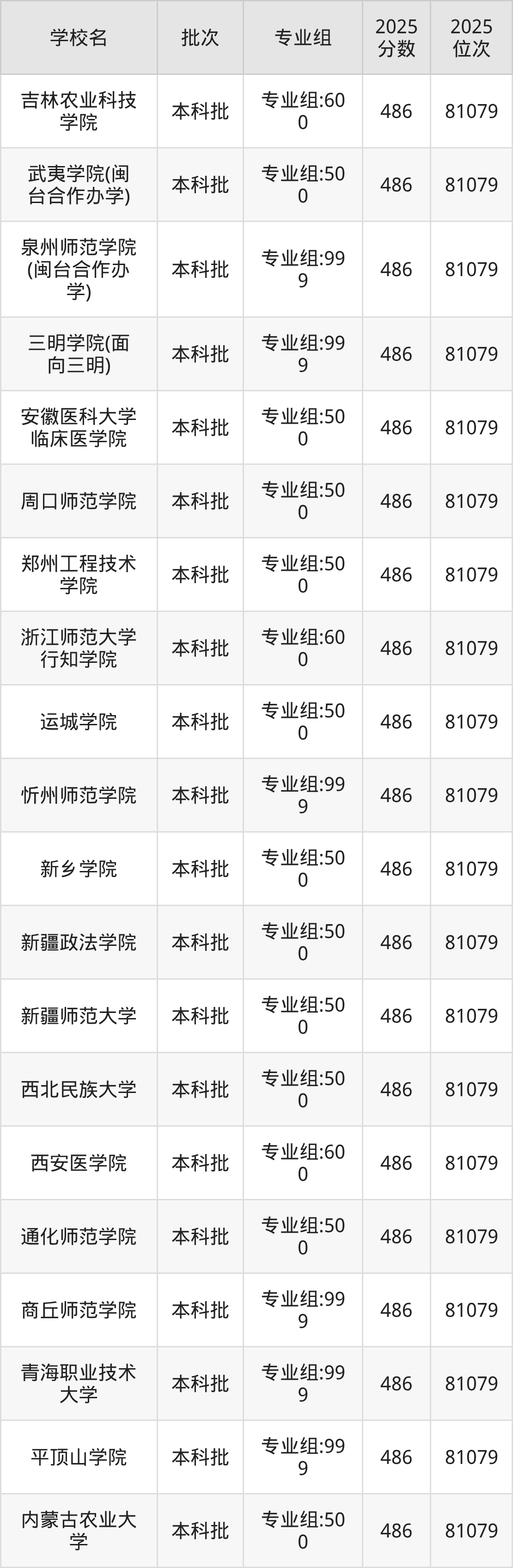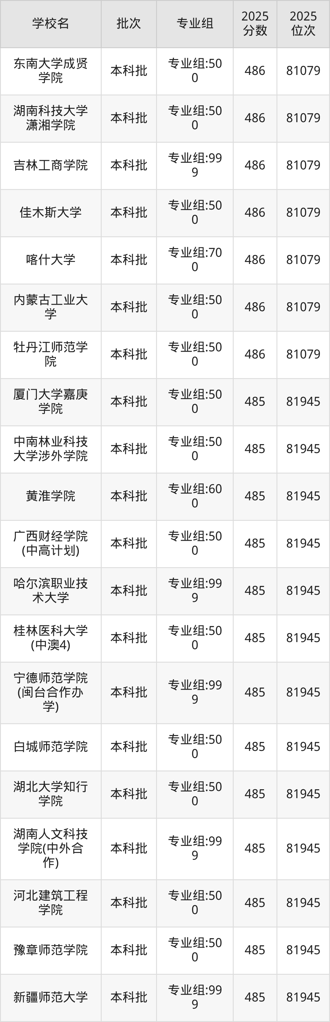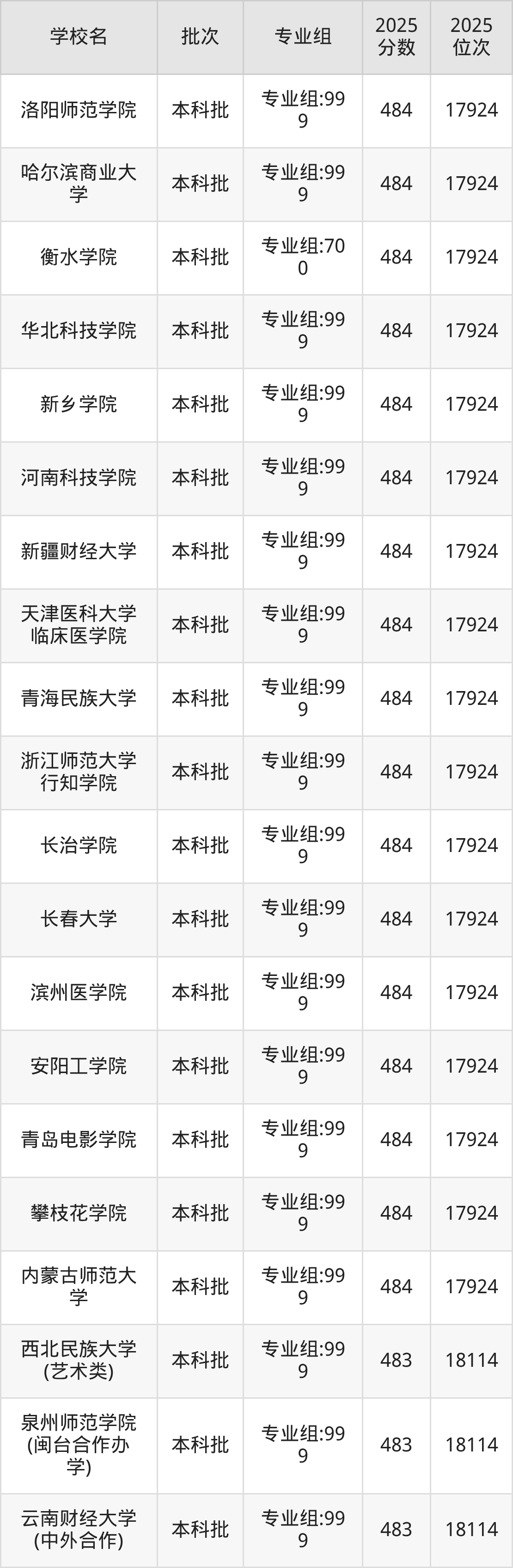 2025年福建高考历史类485分(17497名~17700名)能上的大学有哈尔滨学院专业组:999、湖南科技大学潇湘学院专业组:999、昆明学院专业组:999、兰州石化职业技术大学专业组:999等。
