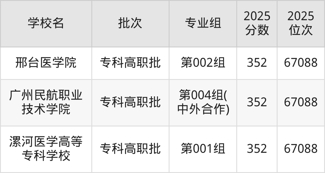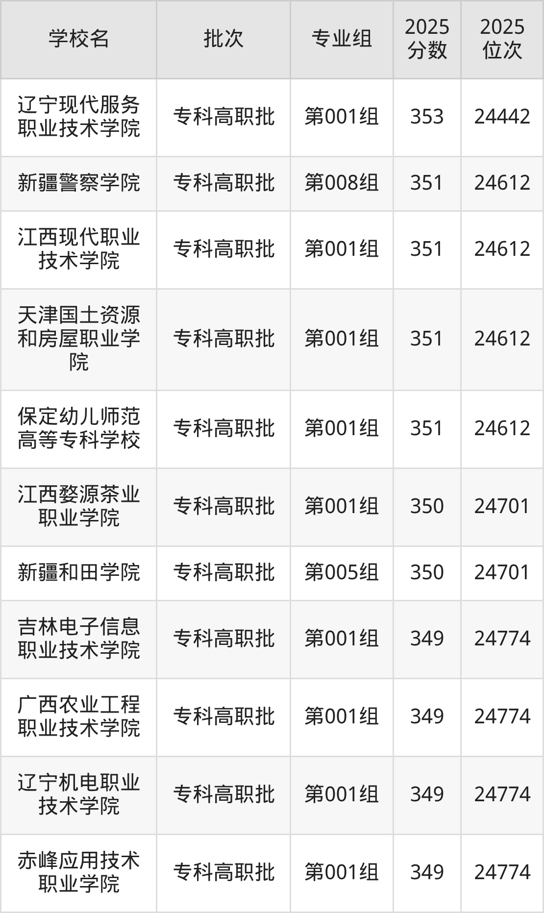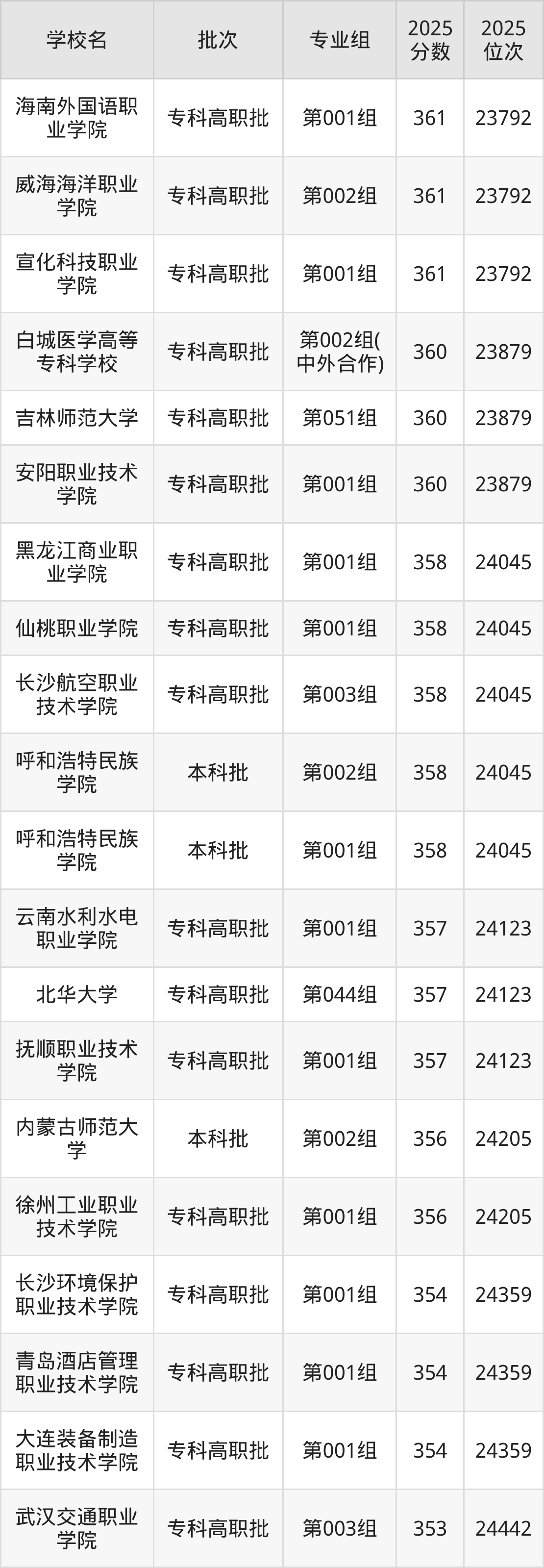 2025年吉林高考历史类354分(24277名~24359名)能上的大学有大连装备制造职业技术学院第001组、青岛酒店管理职业技术学院第001组、长沙环境保护职业技术学院第001组。