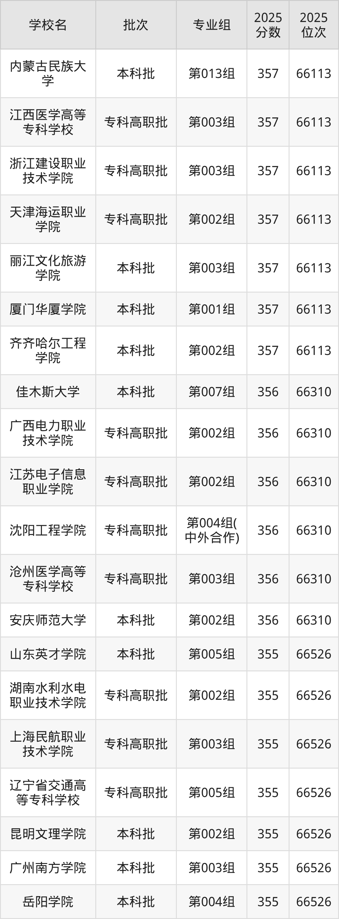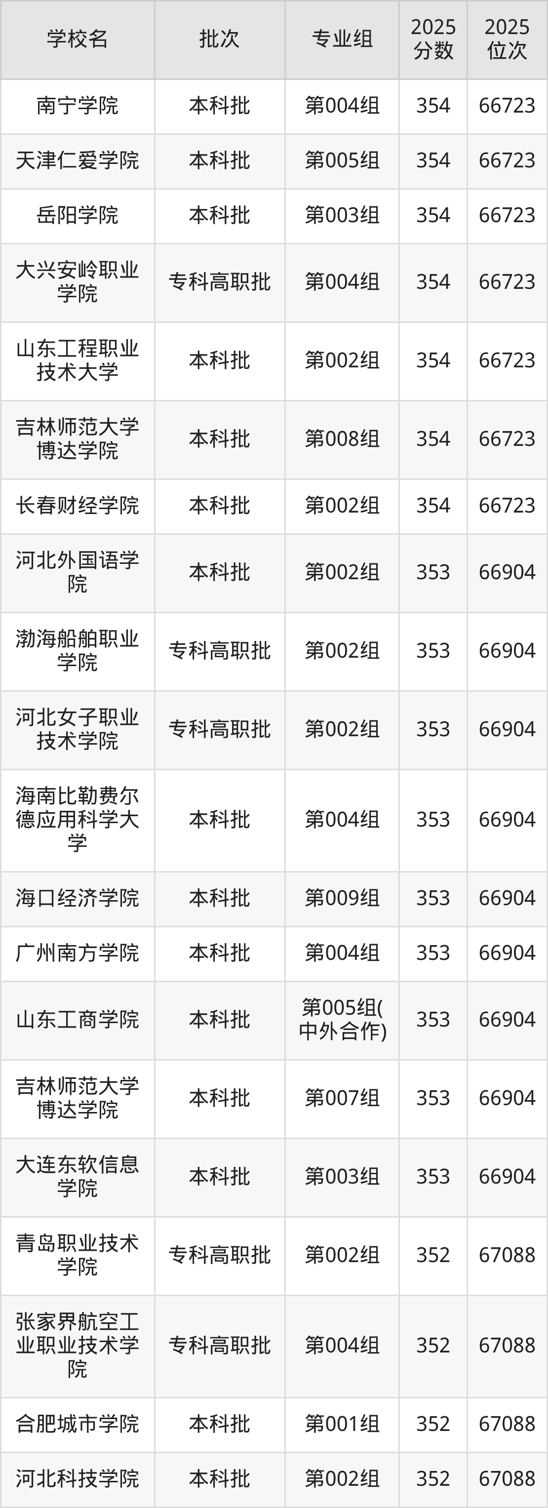 2025年吉林高考物理类354分(66527名~66723名)能上的大学有天津仁爱学院第005组、长春财经学院第002组、吉林师范大学博达学院第008组、山东工程职业技术大学第002组等。