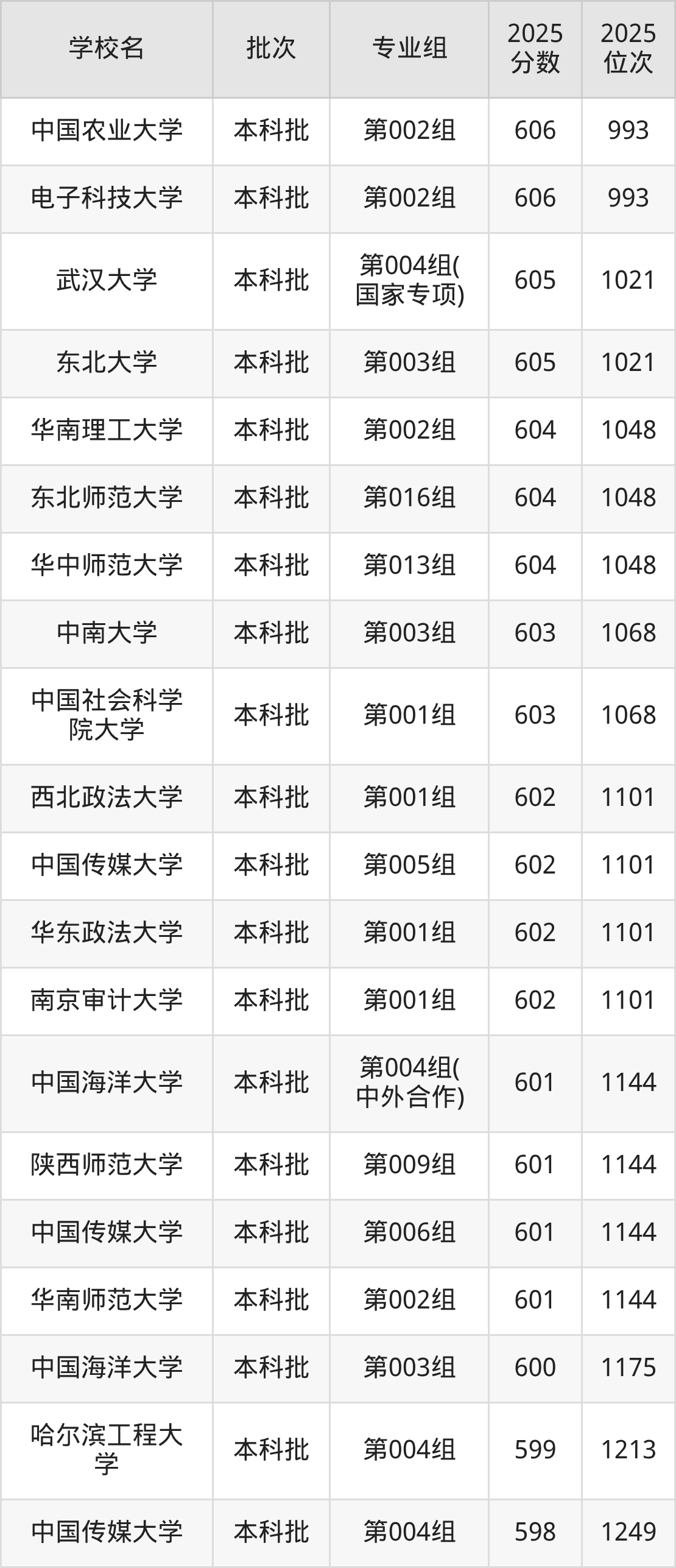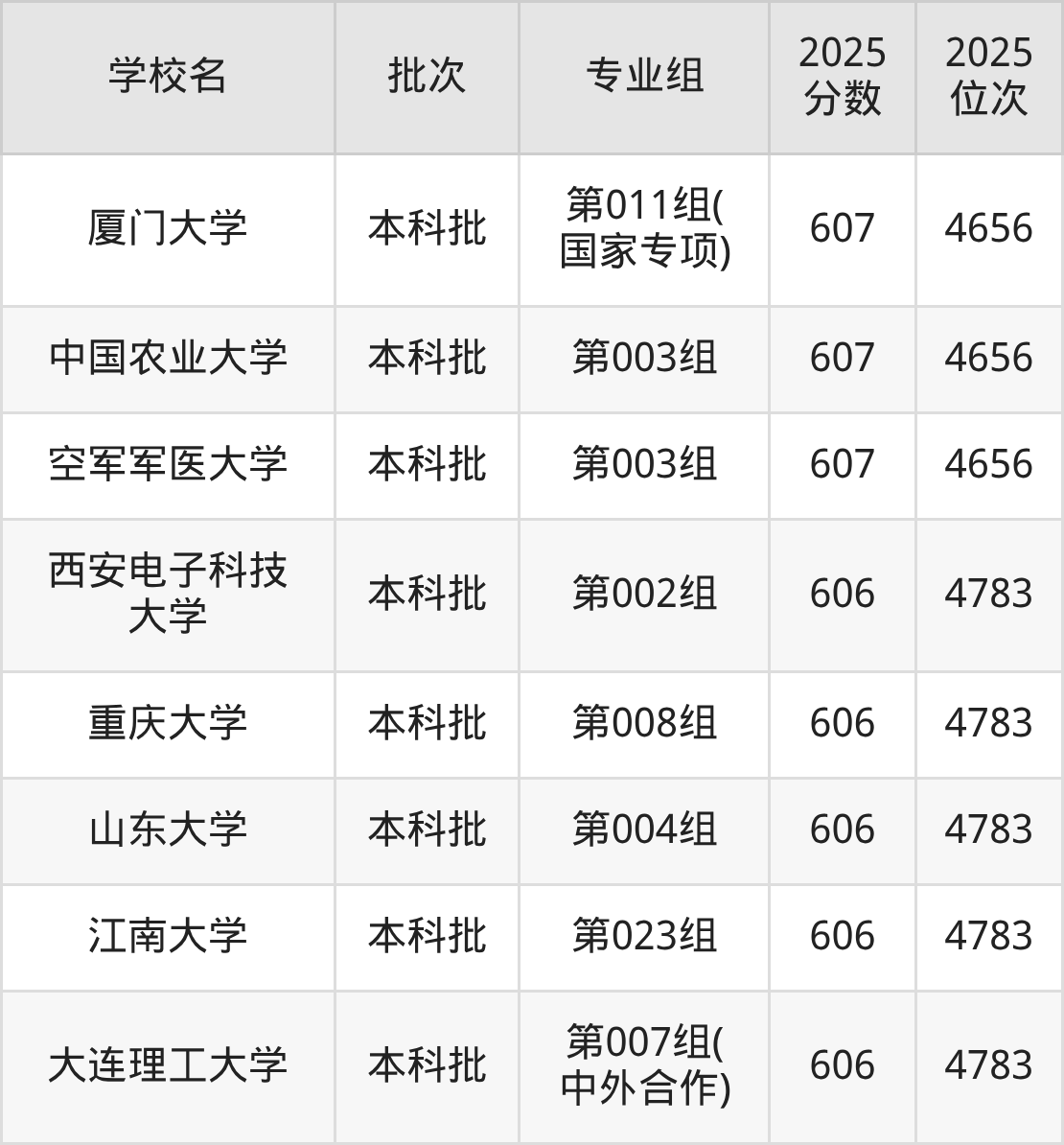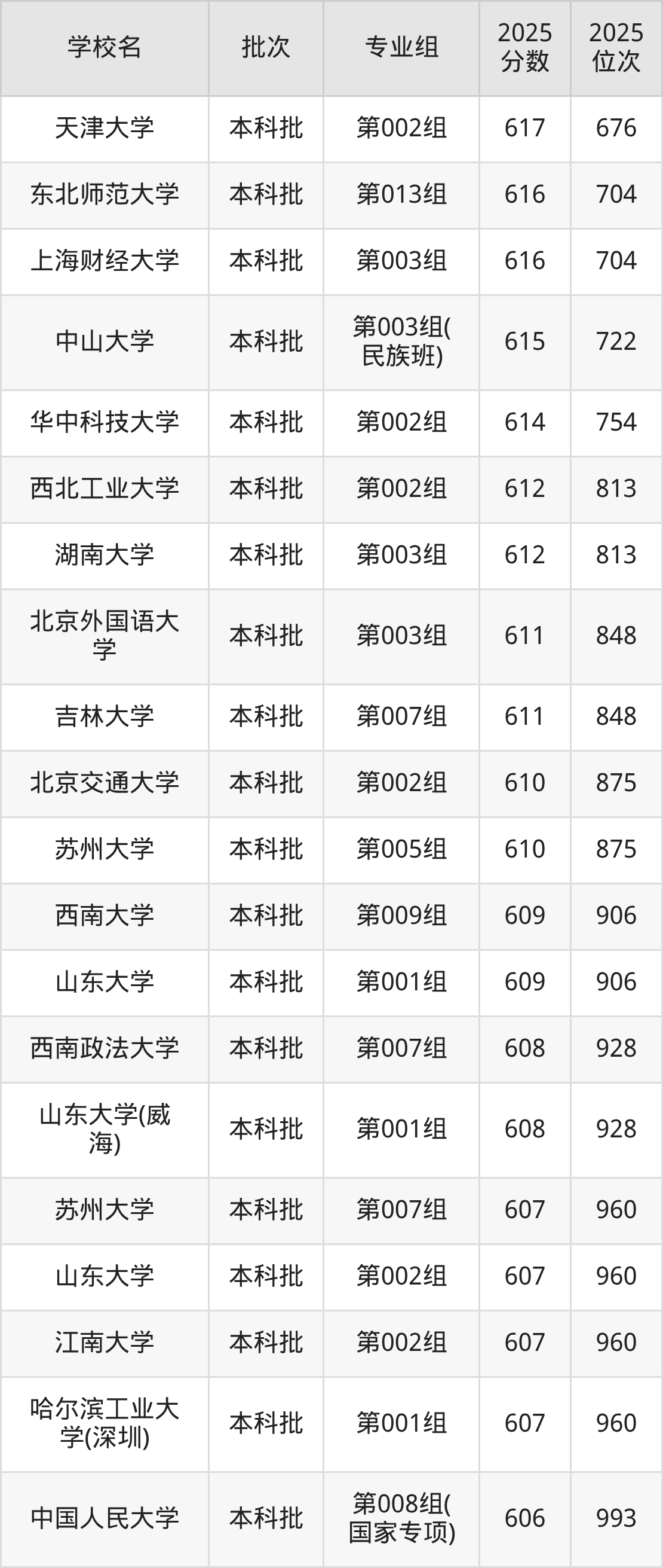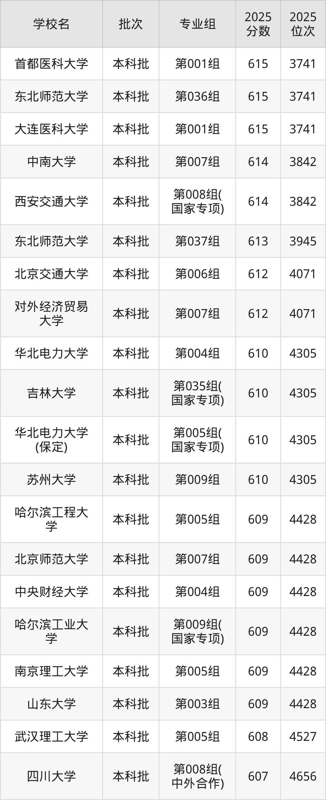 2025年吉林高考物理类610分(4184名~4305名)能上的大学有华北电力大学第004组、华北电力大学(保定)第005组(国家专项)、吉林大学第035组(国家专项)、苏州大学第009组。