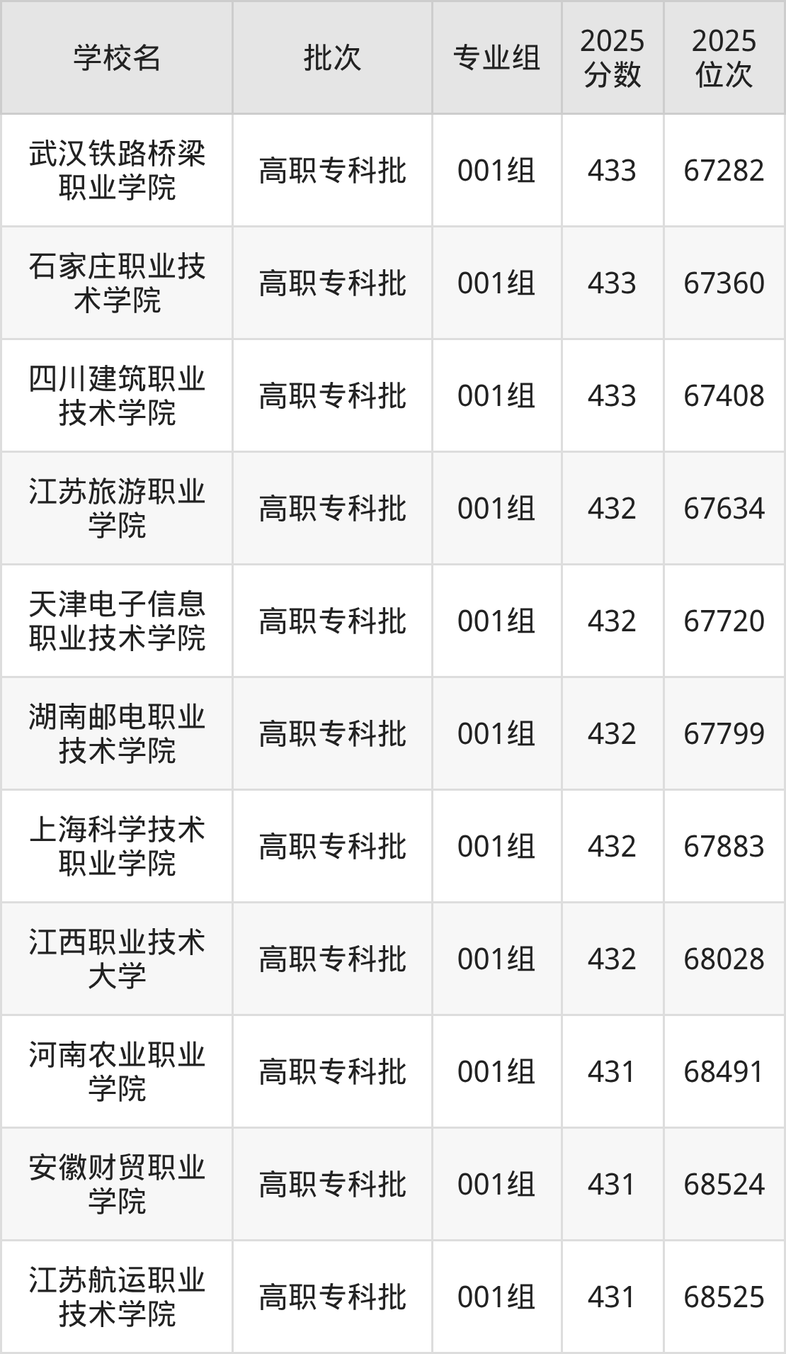 2025年安徽高考历史类432分(67521名~68052名)能上的大学有湖南邮电职业技术学院001组、江苏旅游职业学院001组、江西职业技术大学001组、上海科学技术职业学院001组等。