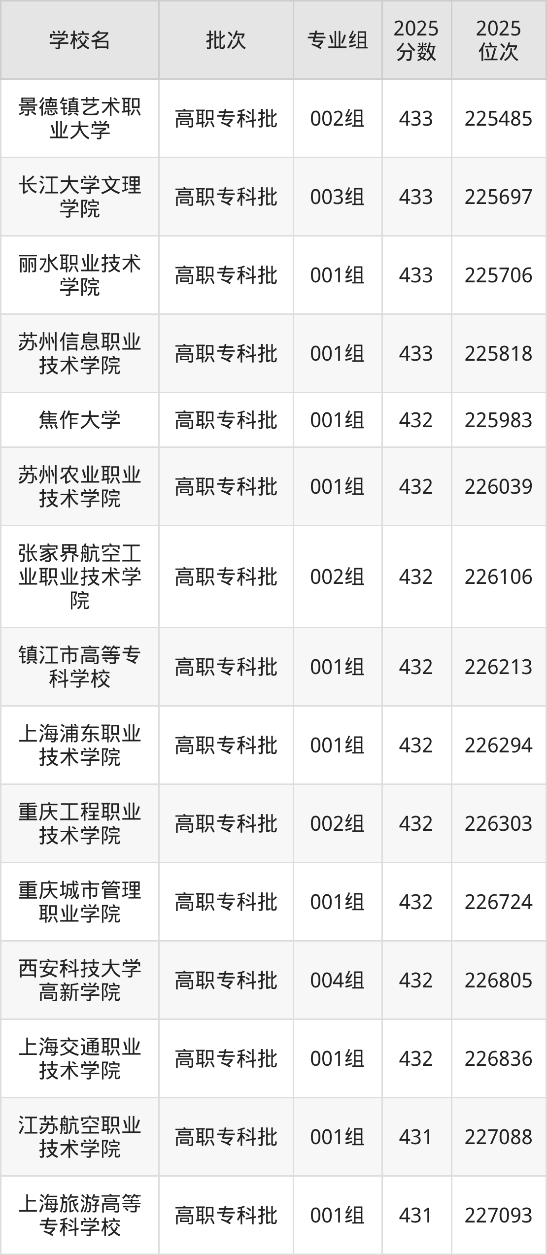 2025年安徽高考物理类432分(225869名~226948名)能上的大学有重庆城市管理职业学院001组、重庆工程职业技术学院002组、焦作大学001组、上海交通职业技术学院001组等。