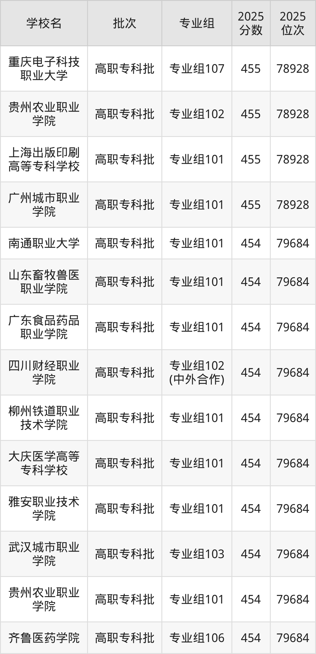 2025年四川高考历史类454分(78929名~79684名)能上的大学有齐鲁医药学院专业组106、广东食品药品职业学院专业组101、四川财经职业学院专业组102(中外合作)、山东畜牧兽医职业学院专业组101等。