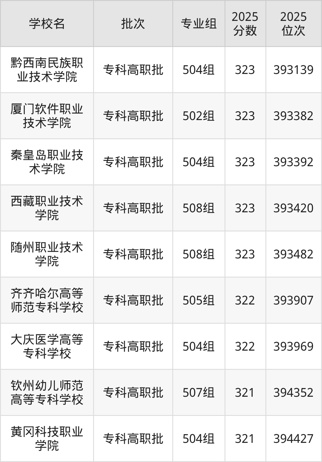 2025年广东高考物理类322分(393520名~394162名)能上的大学有齐齐哈尔高等师范专科学校505组、大庆医学高等专科学校504组。