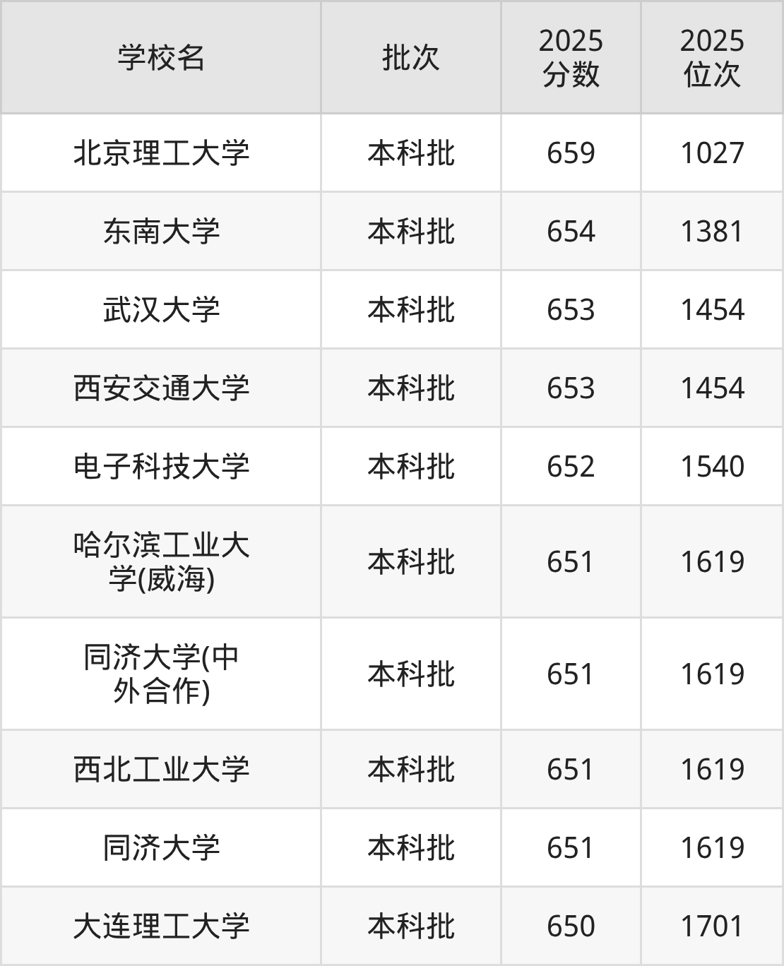 另外录取位次低于该区间(较稳妥)的有西北工业大学(1619名)、哈尔滨工业大学(威海)(1619名)等;录取位次高于该区间(可冲)的有武汉大学(1454名)、西安交通大学(1454名)等。