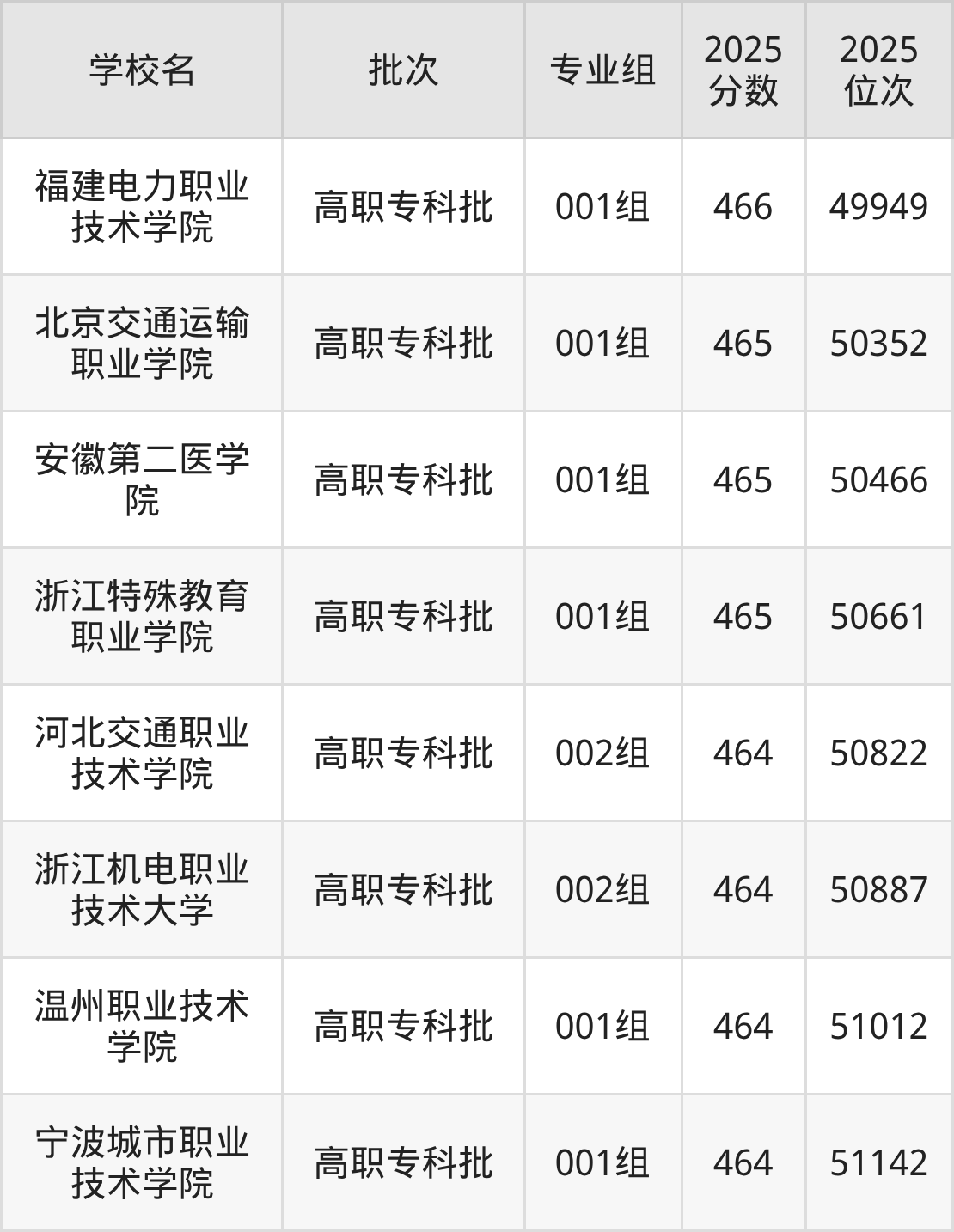 2025年安徽高考历史类465分(50333名~50800名)能上的大学有北京交通运输职业学院001组、浙江特殊教育职业学院001组、安徽第二医学院001组。