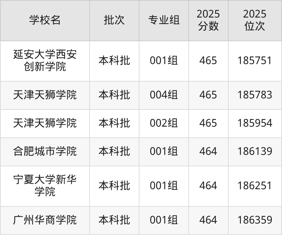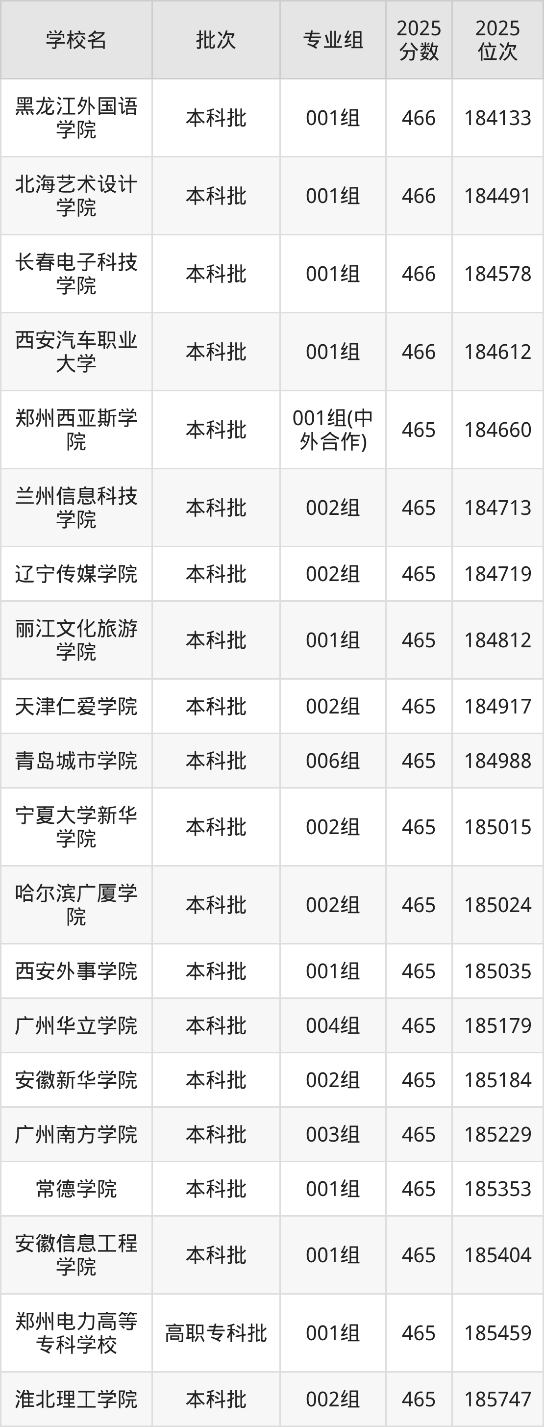 2025年安徽高考物理类465分(184617名~185977名)能上的大学有常德学院001组、广州华立学院004组、广州南方学院003组、哈尔滨广厦学院002组等。