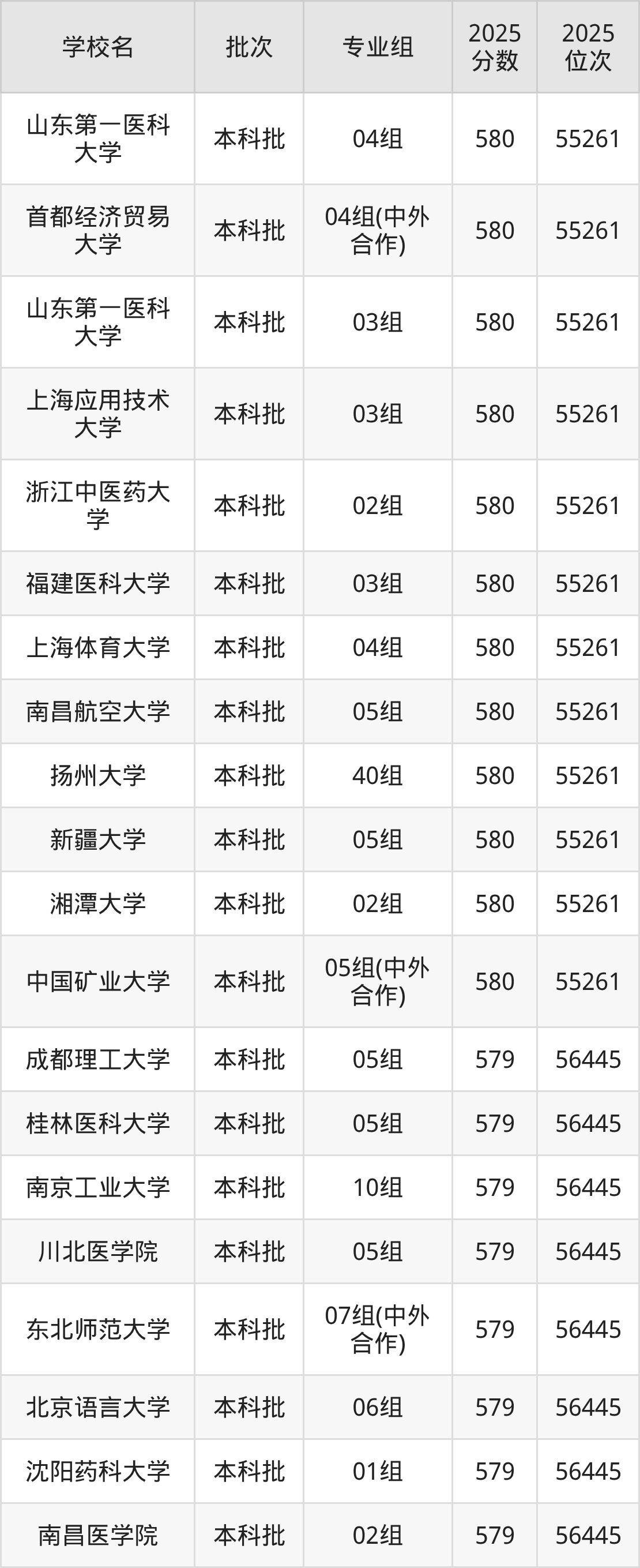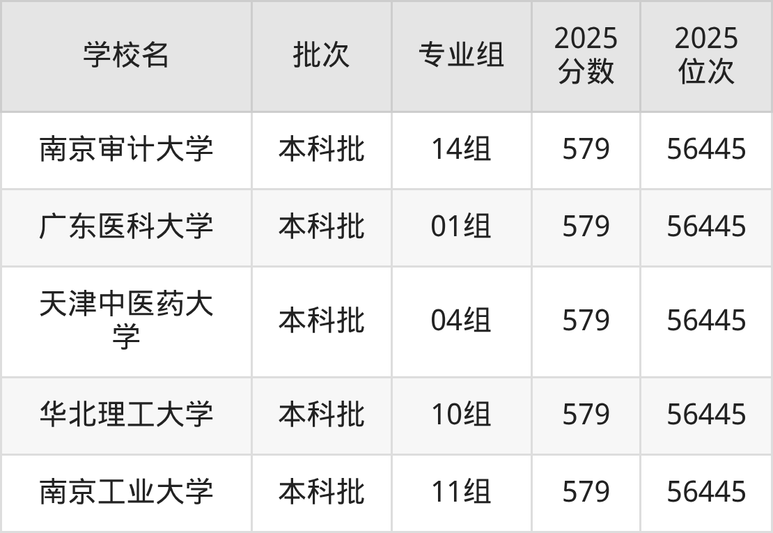 2025年江苏高考物理类579分(55262名~56445名)能上的大学有南京工业大学10组、南京工业大学11组、南京审计大学14组、南昌医学院02组等。