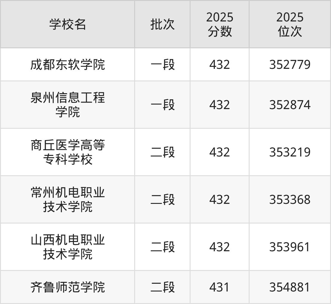 2025年山东高考432分(352212名~354535名)能上的大学有山西机电职业技术学院、商丘医学高等专科学校、泉州信息工程学院、常州机电职业技术学院等。