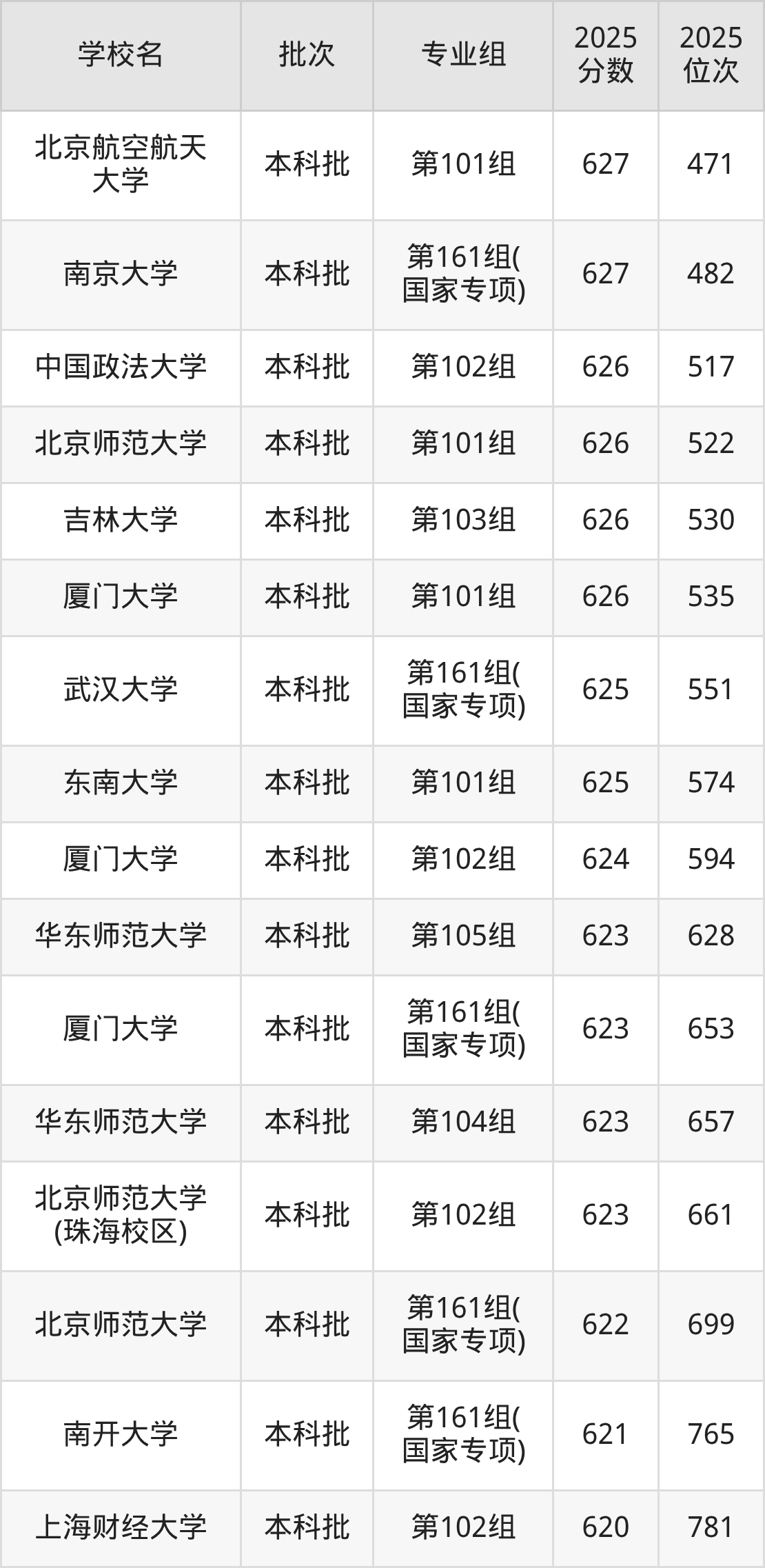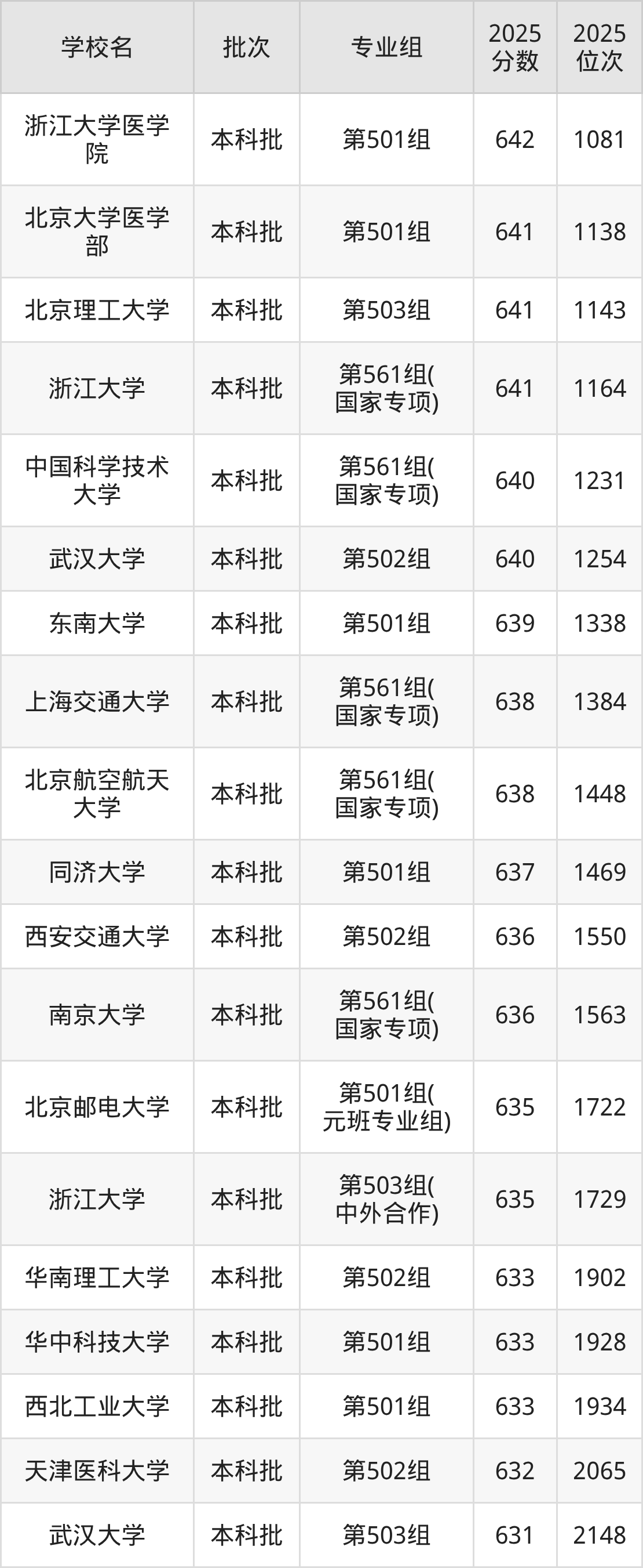 另外录取位次低于该区间(较稳妥)的有北京邮电大学第501组(元班专业组)(1722名)、浙江大学第503组(中外合作)(1729名)等;录取位次高于该区间(可冲)的有同济大学第501组(1469名)、北京航空航天大学第561组(国家专项)(1448名)等。