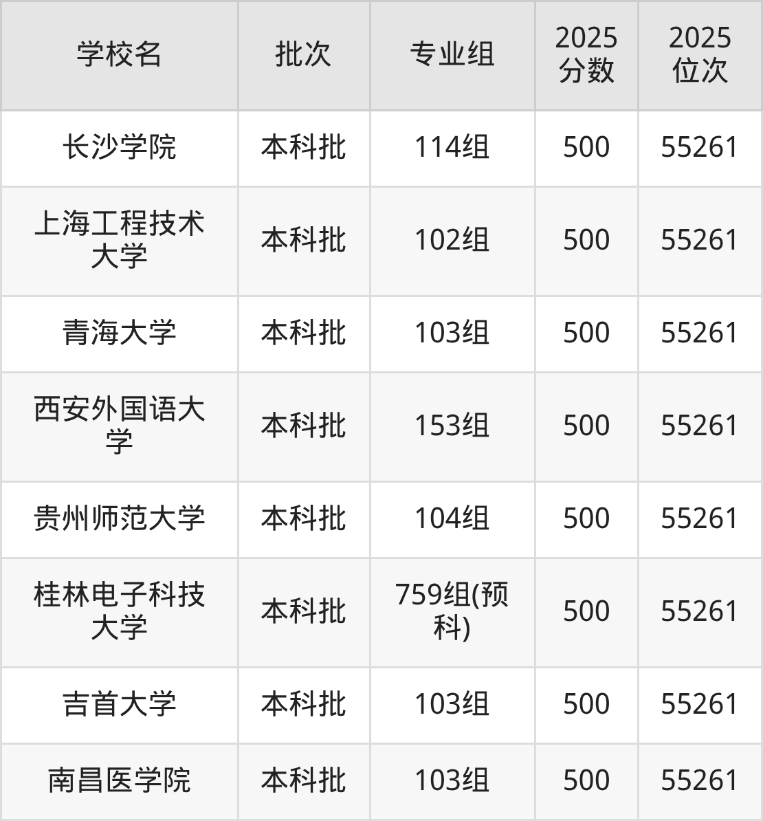 2025年广西高考物理类500分(54561名~55261名)能上的大学有长江大学104组、吉首大学103组、桂林电子科技大学759组(预科)、贵州师范大学104组等。