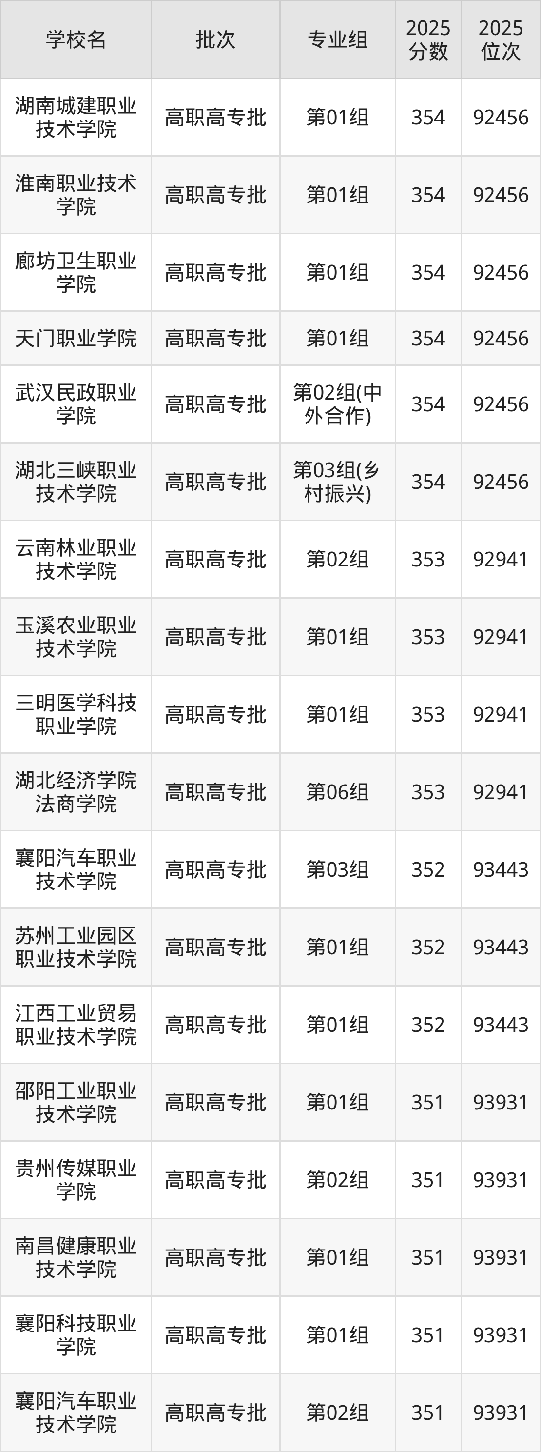 2025年湖北高考历史类352分(92942名~93443名)能上的大学有襄阳汽车职业技术学院第03组、苏州工业园区职业技术学院第01组、江西工业贸易职业技术学院第01组。