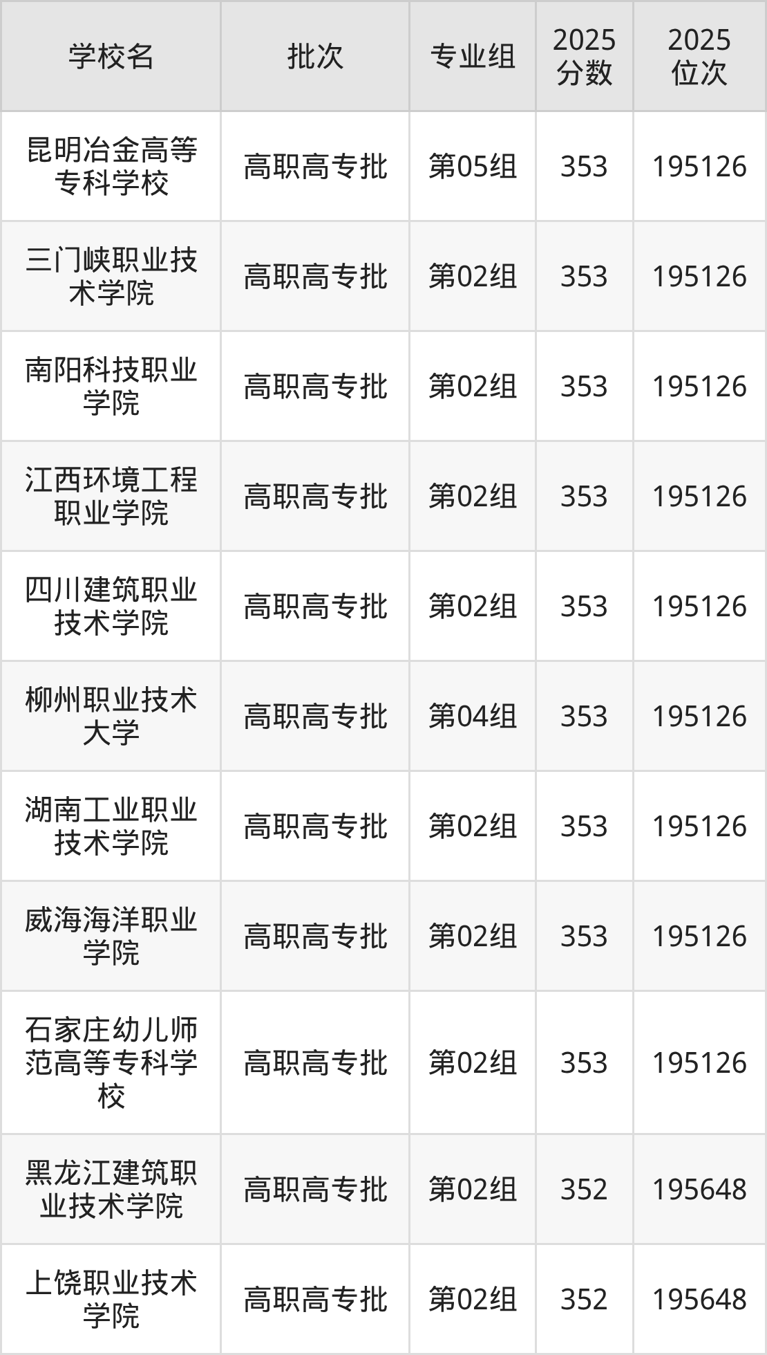 2025年湖北高考物理类352分(195127名~195648名)能上的大学有黑龙江建筑职业技术学院第02组、上饶职业技术学院第02组。