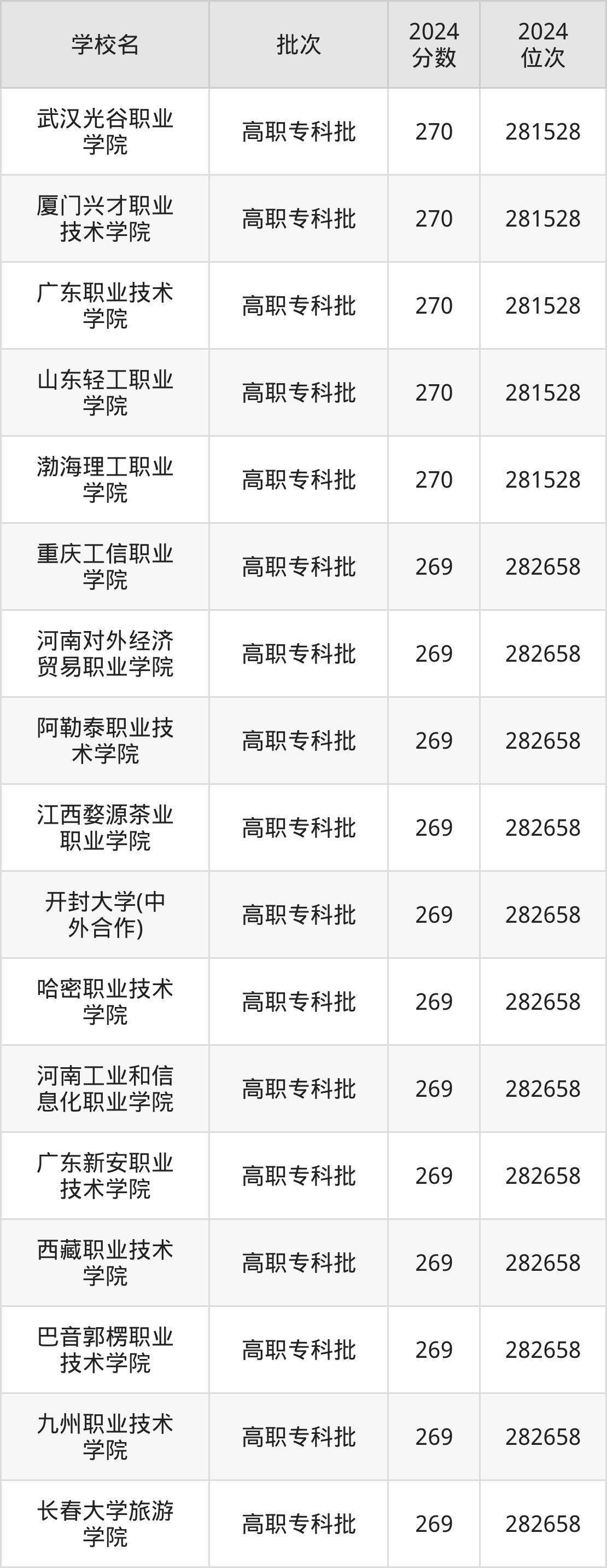 2024年河南高考文科269分(281529名~282658名)能上的大学有长春大学旅游学院、九州职业技术学院、巴音郭楞职业技术学院、西藏职业技术学院等。