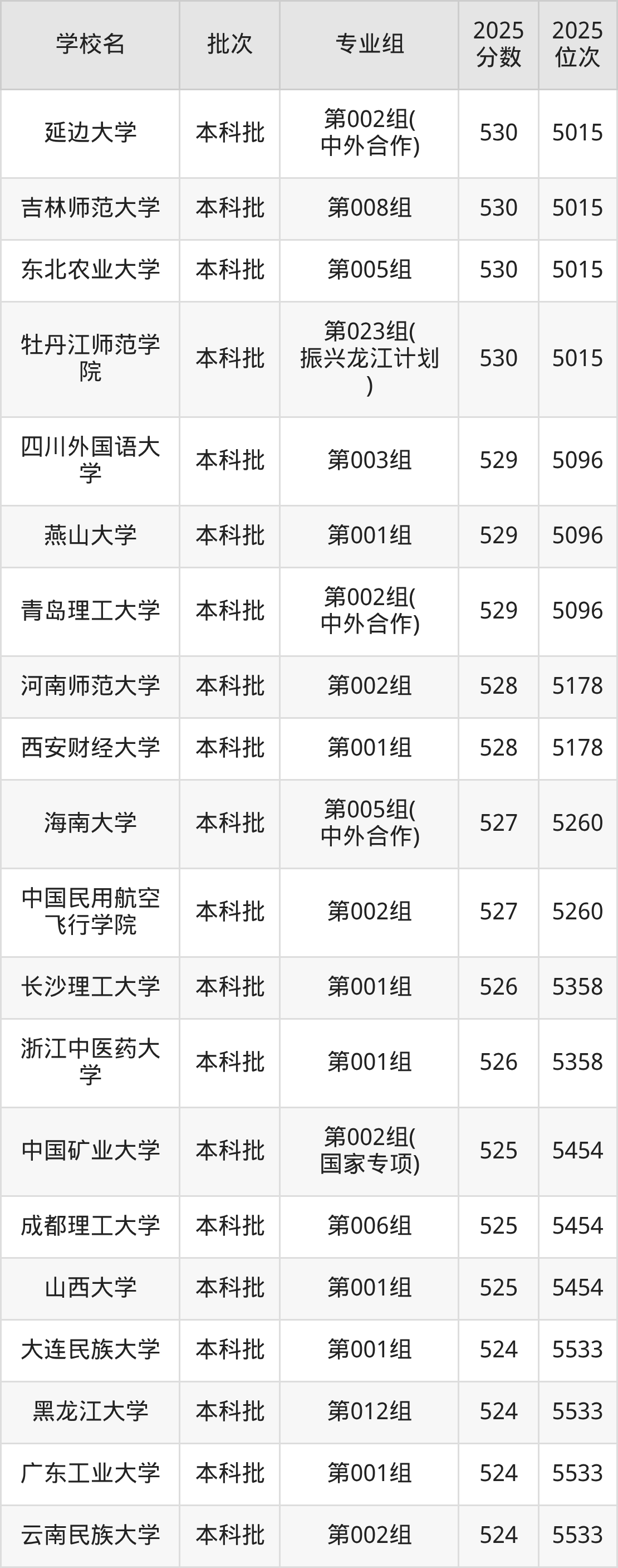 2025年黑龙江高考历史类529分(5016名~5096名)能上的大学有燕山大学第001组、青岛理工大学第002组(中外合作)、四川外国语大学第003组。